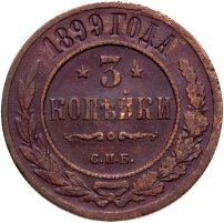 В центре указан номинал — цифра «3», ограниченная с обеих сторон звездочками. Под цифрой номинала — слово "КОПЕЙКИ". Ниже, расположен декоративный разделитель в виде двух изогнутых линий и небольшой окружности между ними. Под разделителем — обозначение монетного двора «С.П.Б.». Центральная часть отделена от остального изображения, окружностью в виде точек. В верхней части полукругом углубленная надпись: "1899 ГОДА". Ниже этой надписи, вдоль канта, изображен венок из лавровой и дубовой ветвей, которые, в нижней части, перевязаны лентой на узел бантом.