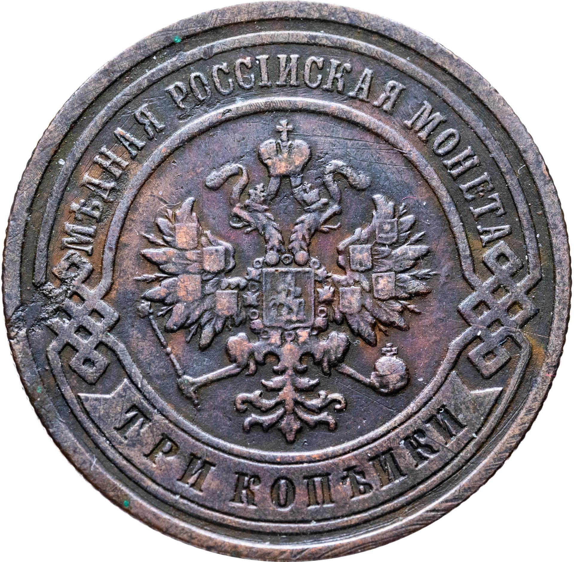 В центре монеты изображен Малый Государственный Герб Российской империи - двуглавый орел, головы которого увенчаны двумя коронами, третья, большая корона над ними. Все они соединены лентой Андрея Первозванного. В правой лапе орла – скипетр, в левой – держава. На его груди расположен Московский герб, в щите изображен Георгий Победоносец с копьем поражающий дракона. Вокруг щита цепь ордена Св. Апостола Андрея Первозванного. На крыльях орла изображены гербы: Царства Казанского, Польского, Херсонеса Таврического, Астраханского, Сибирского, Грузинского и герб соединенных княжеств Киевского, Новгородского и Владимирского — по 4 на каждое крыло. По окружности - две полукруглые плашки, соединенные узорами. На верхней плашке выпуклая надпись: "МЕДНАЯ РОССИЙСКАЯ МОНЕТА". На нижней плашке, изображенной в виде ленты, углубленная надпись: "ТРИ КОПЕЙКИ".