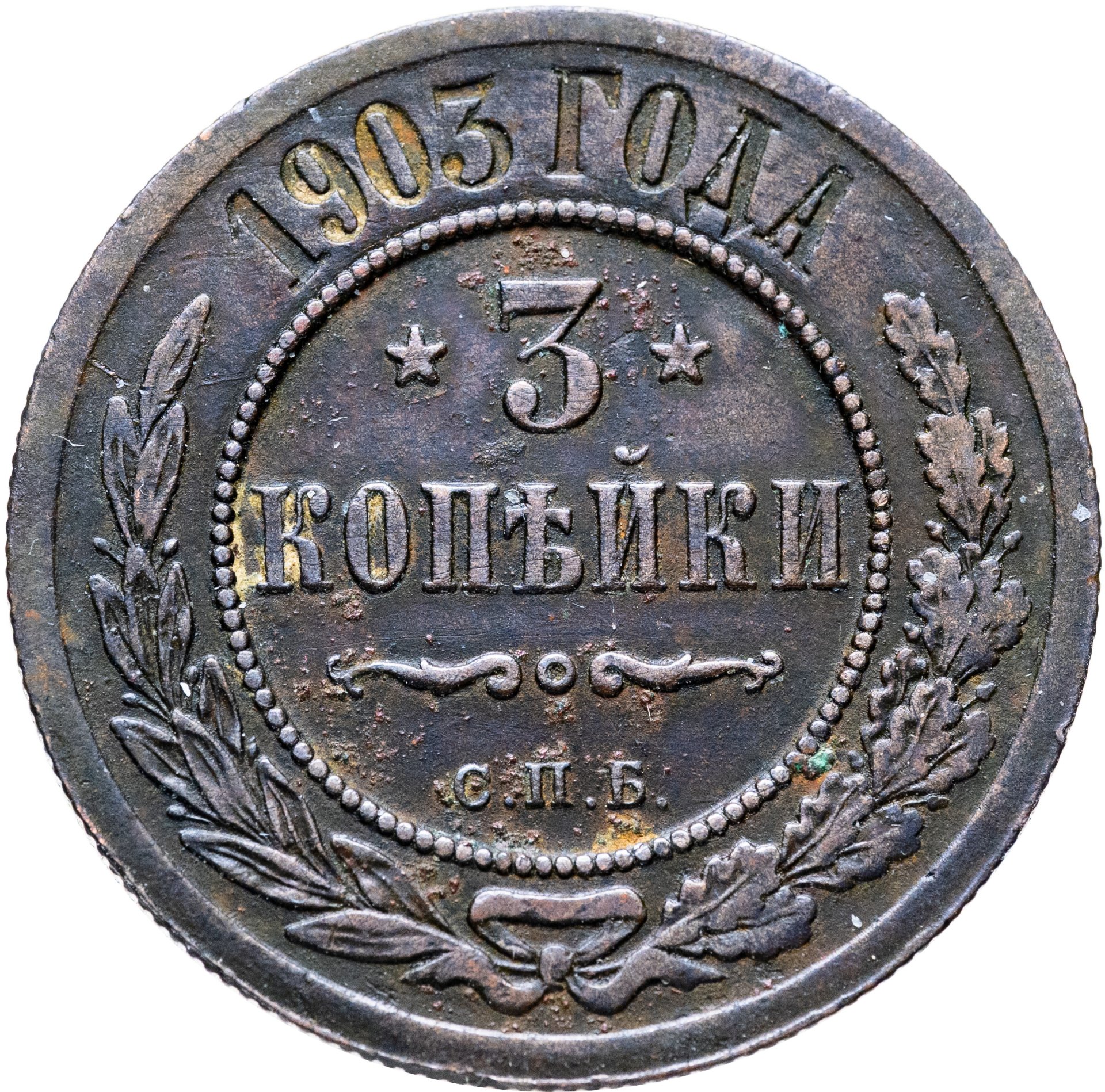 В центре указан номинал — цифра «3», ограниченная с обеих сторон звездочками. Под цифрой номинала — слово "КОПЕЙКИ". Ниже, расположен декоративный разделитель в виде двух изогнутых линий и небольшой окружности между ними. Под разделителем — обозначение монетного двора «С.П.Б.». Центральная часть отделена от остального изображения, окружностью в виде точек. В верхней части полукругом углубленная надпись: "1903 ГОДА". Ниже этой надписи, вдоль канта, изображен венок из лавровой и дубовой ветвей, которые, в нижней части, перевязаны лентой на узел бантом.