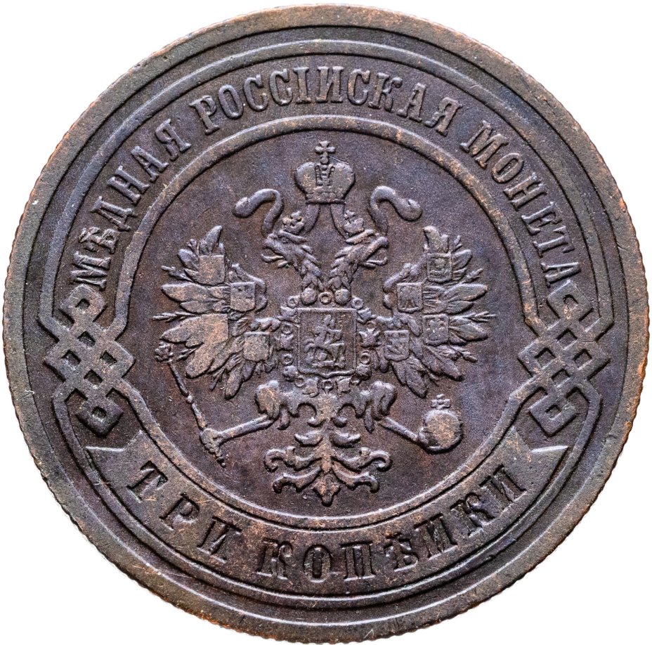 В центре монеты изображен Малый Государственный Герб Российской империи - двуглавый орел, головы которого увенчаны двумя коронами, третья, большая корона над ними. Все они соединены лентой Андрея Первозванного. В правой лапе орла – скипетр, в левой – держава. На его груди расположен Московский герб, в щите изображен Георгий Победоносец с копьем поражающий дракона. Вокруг щита цепь ордена Св. Апостола Андрея Первозванного. На крыльях орла изображены гербы: Царства Казанского, Польского, Херсонеса Таврического, Астраханского, Сибирского, Грузинского и герб соединенных княжеств Киевского, Новгородского и Владимирского — по 4 на каждое крыло. По окружности - две полукруглые плашки, соединенные узорами. На верхней плашке выпуклая надпись: "МЕДНАЯ РОССИЙСКАЯ МОНЕТА". На нижней плашке, изображенной в виде ленты, углубленная надпись: "ТРИ КОПЕЙКИ".