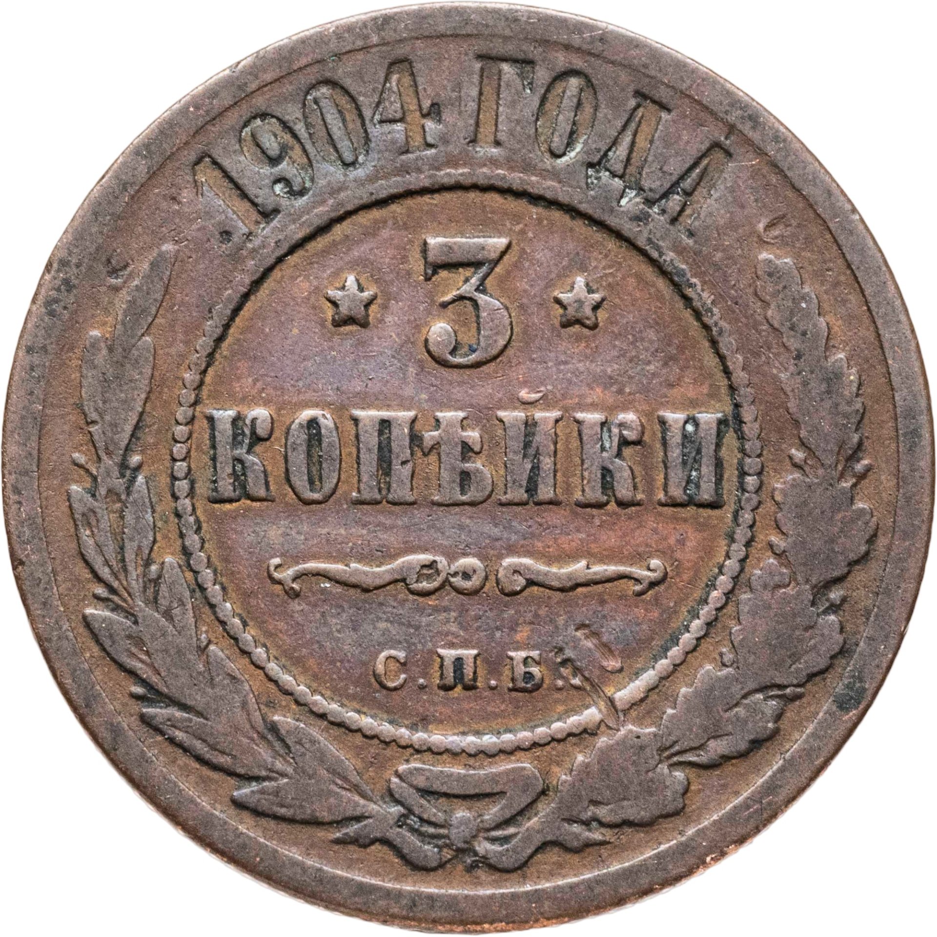 В центре указан номинал — цифра «3», ограниченная с обеих сторон звездочками. Под цифрой номинала — слово "КОПЕЙКИ". Ниже, расположен декоративный разделитель в виде двух изогнутых линий и небольшой окружности между ними. Под разделителем — обозначение монетного двора «С.П.Б.». Центральная часть отделена от остального изображения, окружностью в виде точек. В верхней части полукругом углубленная надпись: "1904 ГОДА". Ниже этой надписи, вдоль канта, изображен венок из лавровой и дубовой ветвей, которые, в нижней части, перевязаны лентой на узел бантом.
