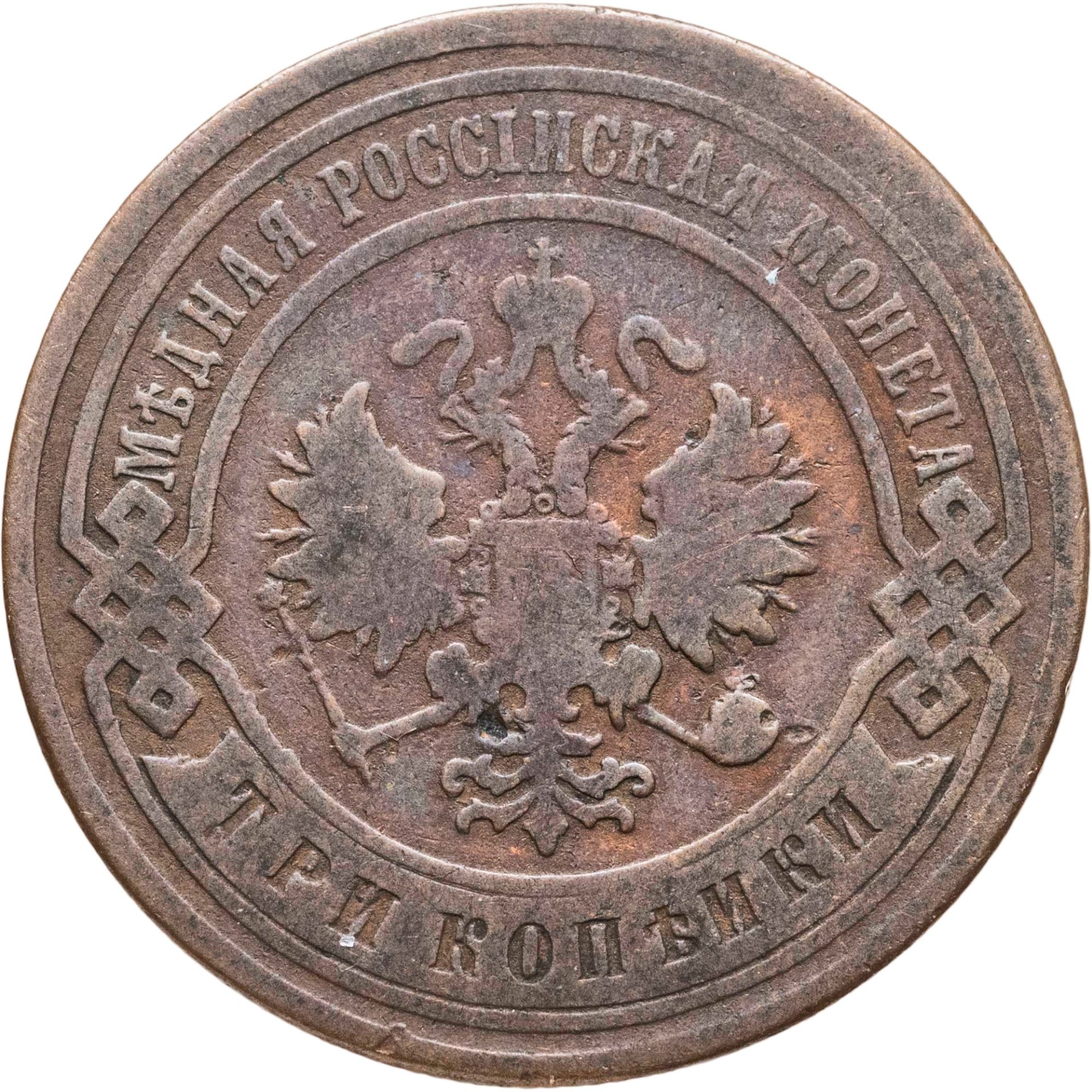 В центре монеты изображен Малый Государственный Герб Российской империи - двуглавый орел, головы которого увенчаны двумя коронами, третья, большая корона над ними. Все они соединены лентой Андрея Первозванного. В правой лапе орла – скипетр, в левой – держава. На его груди расположен Московский герб, в щите изображен Георгий Победоносец с копьем поражающий дракона. Вокруг щита цепь ордена Св. Апостола Андрея Первозванного. На крыльях орла изображены гербы: Царства Казанского, Польского, Херсонеса Таврического, Астраханского, Сибирского, Грузинского и герб соединенных княжеств Киевского, Новгородского и Владимирского — по 4 на каждое крыло. По окружности - две полукруглые плашки, соединенные узорами. На верхней плашке выпуклая надпись: "МЕДНАЯ РОССИЙСКАЯ МОНЕТА". На нижней плашке, изображенной в виде ленты, углубленная надпись: "ТРИ КОПЕЙКИ".