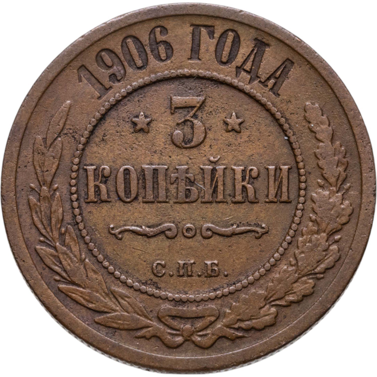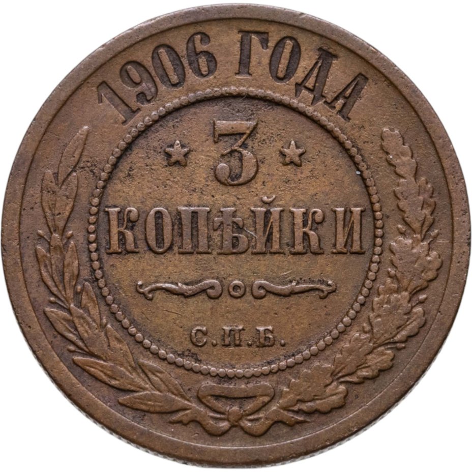 В центре указан номинал — цифра «3», ограниченная с обеих сторон звездочками. Под цифрой номинала — слово "КОПЕЙКИ". Ниже, расположен декоративный разделитель в виде двух изогнутых линий и небольшой окружности между ними. Под разделителем — обозначение монетного двора «С.П.Б.». Центральная часть отделена от остального изображения, окружностью в виде точек. В верхней части полукругом углубленная надпись: "1906 ГОДА". Ниже этой надписи, вдоль канта, изображен венок из лавровой и дубовой ветвей, которые, в нижней части, перевязаны лентой на узел бантом.