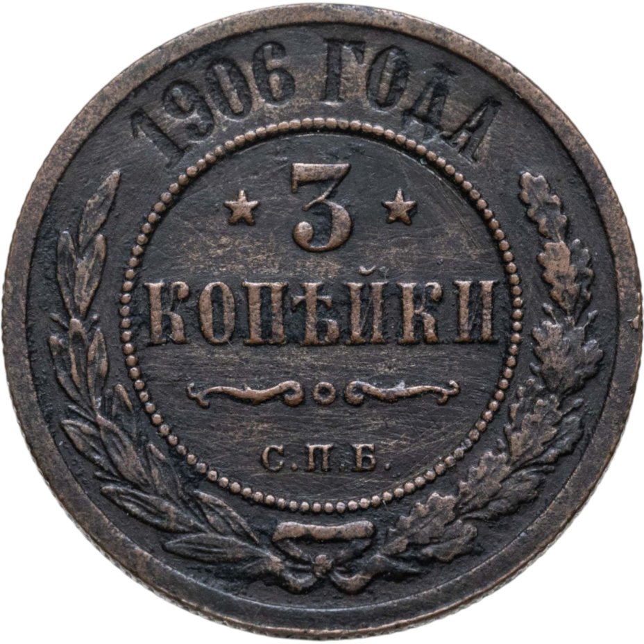В центре указан номинал — цифра «3», ограниченная с обеих сторон звездочками. Под цифрой номинала — слово "КОПЕЙКИ". Ниже, расположен декоративный разделитель в виде двух изогнутых линий и небольшой окружности между ними. Под разделителем — обозначение монетного двора «С.П.Б.». Центральная часть отделена от остального изображения, окружностью в виде точек. В верхней части полукругом углубленная надпись: "1906 ГОДА". Ниже этой надписи, вдоль канта, изображен венок из лавровой и дубовой ветвей, которые, в нижней части, перевязаны лентой на узел бантом.