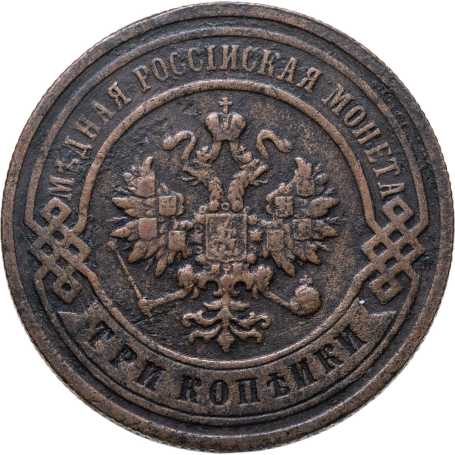 В центре монеты изображен Малый Государственный Герб Российской империи - двуглавый орел, головы которого увенчаны двумя коронами, третья, большая корона над ними. Все они соединены лентой Андрея Первозванного. В правой лапе орла – скипетр, в левой – держава. На его груди расположен Московский герб, в щите изображен Георгий Победоносец с копьем поражающий дракона. Вокруг щита цепь ордена Св. Апостола Андрея Первозванного. На крыльях орла изображены гербы: Царства Казанского, Польского, Херсонеса Таврического, Астраханского, Сибирского, Грузинского и герб соединенных княжеств Киевского, Новгородского и Владимирского — по 4 на каждое крыло. По окружности - две полукруглые плашки, соединенные узорами. На верхней плашке выпуклая надпись: "МЕДНАЯ РОССИЙСКАЯ МОНЕТА". На нижней плашке, изображенной в виде ленты, углубленная надпись: "ТРИ КОПЕЙКИ".