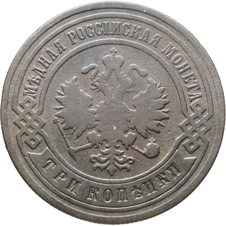 В центре монеты изображен Малый Государственный Герб Российской империи - двуглавый орел, головы которого увенчаны двумя коронами, третья, большая корона над ними. Все они соединены лентой Андрея Первозванного. В правой лапе орла – скипетр, в левой – держава. На его груди расположен Московский герб, в щите изображен Георгий Победоносец с копьем поражающий дракона. Вокруг щита цепь ордена Св. Апостола Андрея Первозванного. На крыльях орла изображены гербы: Царства Казанского, Польского, Херсонеса Таврического, Астраханского, Сибирского, Грузинского и герб соединенных княжеств Киевского, Новгородского и Владимирского — по 4 на каждое крыло. По окружности - две полукруглые плашки, соединенные узорами. На верхней плашке выпуклая надпись: "МЕДНАЯ РОССИЙСКАЯ МОНЕТА". На нижней плашке, изображенной в виде ленты, углубленная надпись: "ТРИ КОПЕЙКИ".