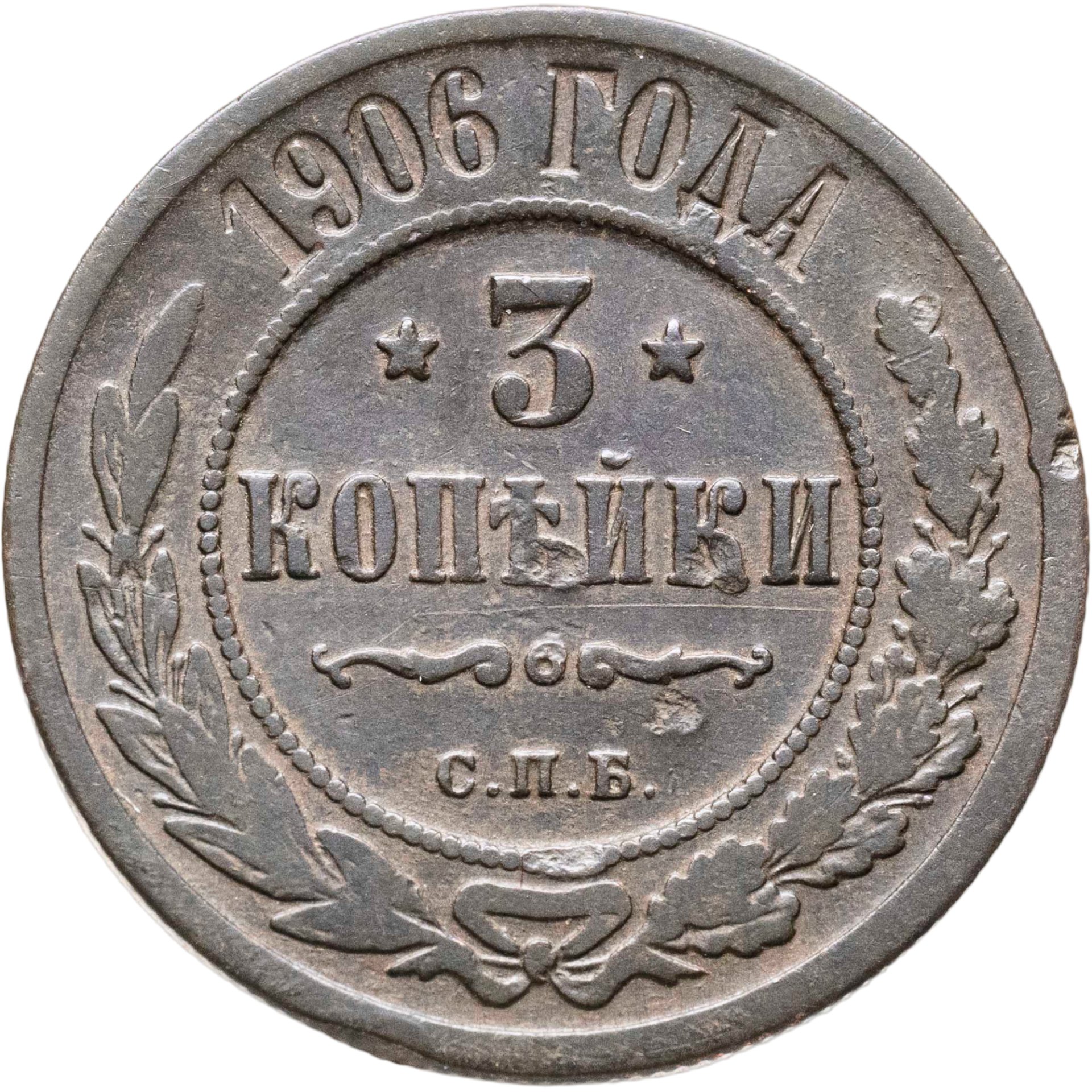В центре указан номинал — цифра «3», ограниченная с обеих сторон звездочками. Под цифрой номинала — слово "КОПЕЙКИ". Ниже, расположен декоративный разделитель в виде двух изогнутых линий и небольшой окружности между ними. Под разделителем — обозначение монетного двора «С.П.Б.». Центральная часть отделена от остального изображения, окружностью в виде точек. В верхней части полукругом углубленная надпись: "1906 ГОДА". Ниже этой надписи, вдоль канта, изображен венок из лавровой и дубовой ветвей, которые, в нижней части, перевязаны лентой на узел бантом.