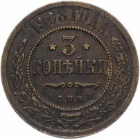 В центре указан номинал — цифра «3», ограниченная с обеих сторон звездочками. Под цифрой номинала — слово "КОПЕЙКИ". Ниже, расположен декоративный разделитель в виде двух изогнутых линий и небольшой окружности между ними. Под разделителем — обозначение монетного двора «С.П.Б.». Центральная часть отделена от остального изображения, окружностью в виде точек. В верхней части полукругом углубленная надпись: "1908 ГОДА". Ниже этой надписи, вдоль канта, изображен венок из лавровой и дубовой ветвей, которые, в нижней части, перевязаны лентой на узел бантом.