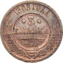 В центре указан номинал — цифра «3», ограниченная с обеих сторон звездочками. Под цифрой номинала — слово "КОПЕЙКИ". Ниже, расположен декоративный разделитель в виде двух изогнутых линий и небольшой окружности между ними. Под разделителем — обозначение монетного двора «С.П.Б.». Центральная часть отделена от остального изображения, окружностью в виде точек. В верхней части полукругом углубленная надпись: "1908 ГОДА". Ниже этой надписи, вдоль канта, изображен венок из лавровой и дубовой ветвей, которые, в нижней части, перевязаны лентой на узел бантом.