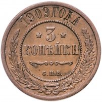 В центре указан номинал — цифра «3», ограниченная с обеих сторон звездочками. Под цифрой номинала — слово "КОПЕЙКИ". Ниже, расположен декоративный разделитель в виде двух изогнутых линий и небольшой окружности между ними. Под разделителем — обозначение монетного двора «С.П.Б.». Центральная часть отделена от остального изображения, окружностью в виде точек. В верхней части полукругом углубленная надпись: "1909 ГОДА". Ниже этой надписи, вдоль канта, изображен венок из лавровой и дубовой ветвей, которые, в нижней части, перевязаны лентой на узел бантом.