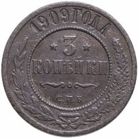 В центре указан номинал — цифра «3», ограниченная с обеих сторон звездочками. Под цифрой номинала — слово "КОПЕЙКИ". Ниже, расположен декоративный разделитель в виде двух изогнутых линий и небольшой окружности между ними. Под разделителем — обозначение монетного двора «С.П.Б.». Центральная часть отделена от остального изображения, окружностью в виде точек. В верхней части полукругом углубленная надпись: "1909 ГОДА". Ниже этой надписи, вдоль канта, изображен венок из лавровой и дубовой ветвей, которые, в нижней части, перевязаны лентой на узел бантом.