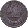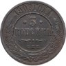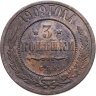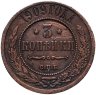 В центре монеты изображен Малый Государственный Герб Российской империи - двуглавый орел, головы которого увенчаны двумя коронами, третья, большая корона над ними. Все они соединены лентой Андрея Первозванного. В правой лапе орла – скипетр, в левой – держава. На его груди расположен Московский герб, в щите изображен Георгий Победоносец с копьем поражающий дракона. Вокруг щита цепь ордена Св. Апостола Андрея Первозванного. На крыльях орла изображены гербы: Царства Казанского, Польского, Херсонеса Таврического, Астраханского, Сибирского, Грузинского и герб соединенных княжеств Киевского, Новгородского и Владимирского — по 4 на каждое крыло. По окружности - две полукруглые плашки, соединенные узорами. На верхней плашке выпуклая надпись: "МЕДНАЯ РОССИЙСКАЯ МОНЕТА". На нижней плашке, изображенной в виде ленты, углубленная надпись: "ТРИ КОПЕЙКИ".