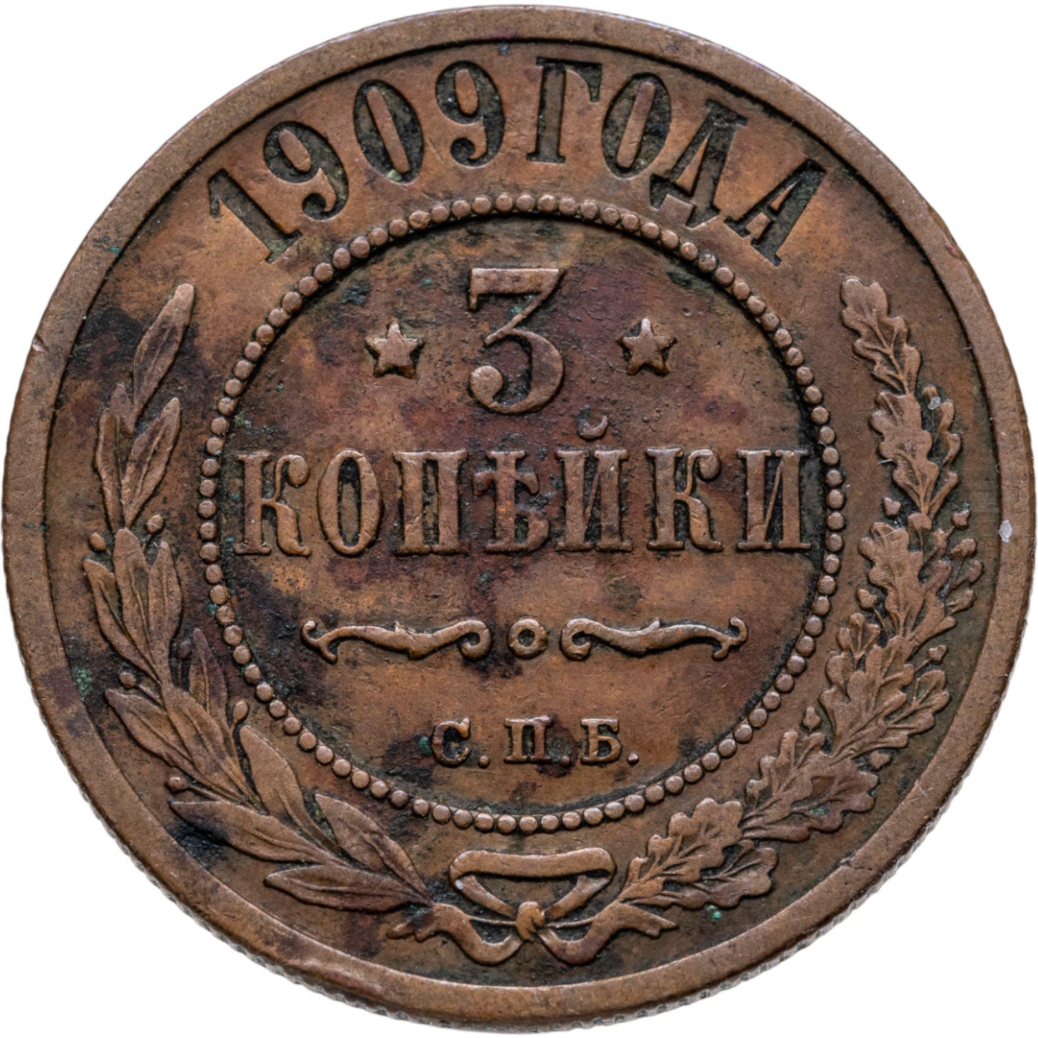 В центре указан номинал — цифра «3», ограниченная с обеих сторон звездочками. Под цифрой номинала — слово "КОПЕЙКИ". Ниже, расположен декоративный разделитель в виде двух изогнутых линий и небольшой окружности между ними. Под разделителем — обозначение монетного двора «С.П.Б.». Центральная часть отделена от остального изображения, окружностью в виде точек. В верхней части полукругом углубленная надпись: "1909 ГОДА". Ниже этой надписи, вдоль канта, изображен венок из лавровой и дубовой ветвей, которые, в нижней части, перевязаны лентой на узел бантом.