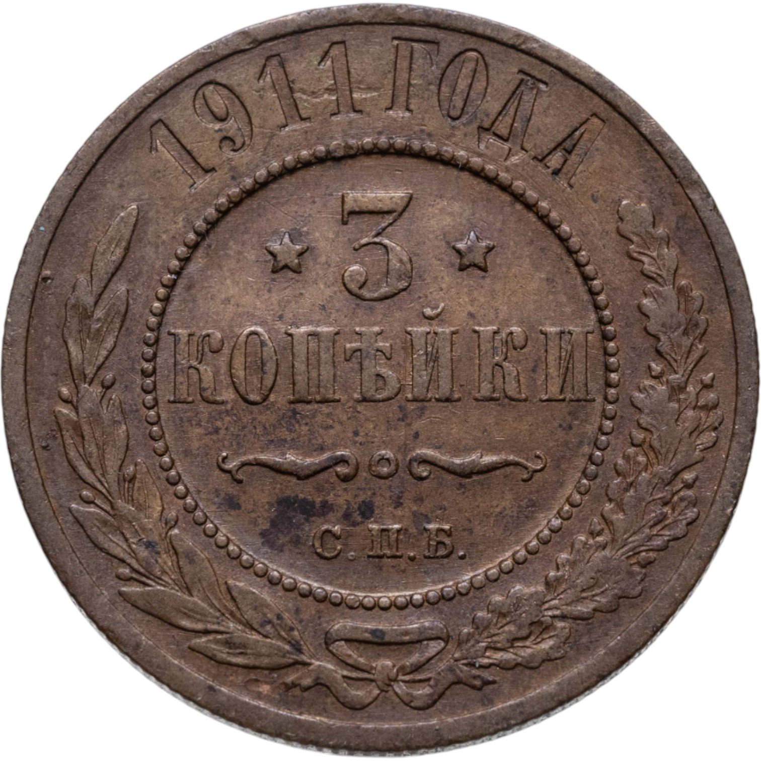 В центре указан номинал — цифра «3», ограниченная с обеих сторон звездочками. Под цифрой номинала — слово "КОПЕЙКИ". Ниже, расположен декоративный разделитель в виде двух изогнутых линий и небольшой окружности между ними. Под разделителем — обозначение монетного двора «С.П.Б.». Центральная часть отделена от остального изображения, окружностью в виде точек. В верхней части полукругом углубленная надпись: "1911 ГОДА". Ниже этой надписи, вдоль канта, изображен венок из лавровой и дубовой ветвей, которые, в нижней части, перевязаны лентой на узел бантом.