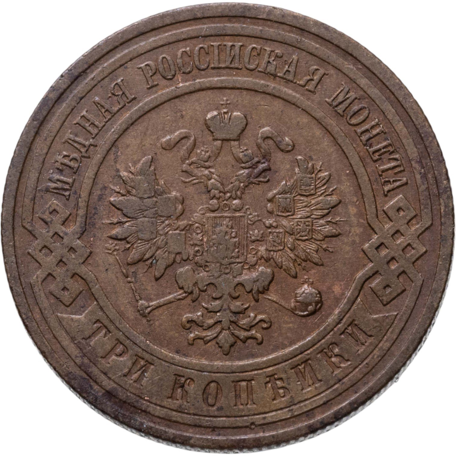 В центре монеты изображен Малый Государственный Герб Российской империи - двуглавый орел, головы которого увенчаны двумя коронами, третья, большая корона над ними. Все они соединены лентой Андрея Первозванного. В правой лапе орла – скипетр, в левой – держава. На его груди расположен Московский герб, в щите изображен Георгий Победоносец с копьем поражающий дракона. Вокруг щита цепь ордена Св. Апостола Андрея Первозванного. На крыльях орла изображены гербы: Царства Казанского, Польского, Херсонеса Таврического, Астраханского, Сибирского, Грузинского и герб соединенных княжеств Киевского, Новгородского и Владимирского — по 4 на каждое крыло. По окружности - две полукруглые плашки, соединенные узорами. На верхней плашке выпуклая надпись: "МЕДНАЯ РОССИЙСКАЯ МОНЕТА". На нижней плашке, изображенной в виде ленты, углубленная надпись: "ТРИ КОПЕЙКИ".