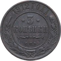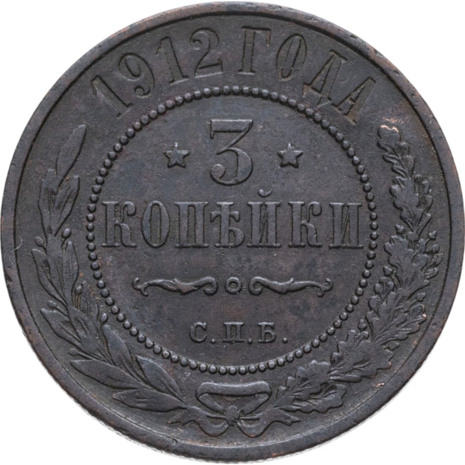 В центре указан номинал — цифра «3», ограниченная с обеих сторон звездочками. Под цифрой номинала — слово "КОПЕЙКИ". Ниже, расположен декоративный разделитель в виде двух изогнутых линий и небольшой окружности между ними. Под разделителем — обозначение монетного двора «С.П.Б.». Центральная часть отделена от остального изображения, окружностью в виде точек. В верхней части полукругом углубленная надпись: "1912 ГОДА". Ниже этой надписи, вдоль канта, изображен венок из лавровой и дубовой ветвей, которые, в нижней части, перевязаны лентой на узел бантом.
