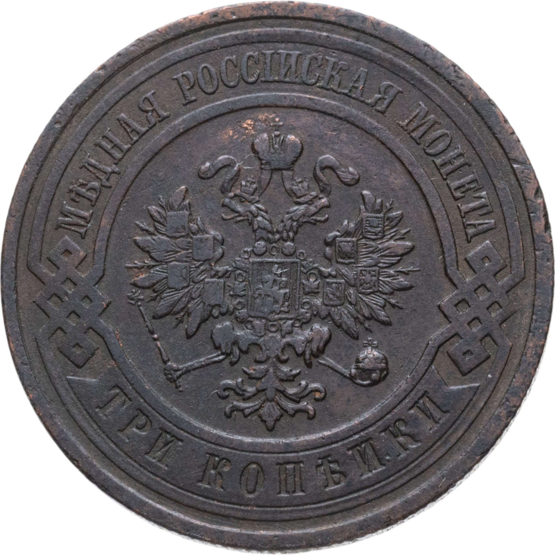 В центре монеты изображен Малый Государственный Герб Российской империи - двуглавый орел, головы которого увенчаны двумя коронами, третья, большая корона над ними. Все они соединены лентой Андрея Первозванного. В правой лапе орла – скипетр, в левой – держава. На его груди расположен Московский герб, в щите изображен Георгий Победоносец с копьем поражающий дракона. Вокруг щита цепь ордена Св. Апостола Андрея Первозванного. На крыльях орла изображены гербы: Царства Казанского, Польского, Херсонеса Таврического, Астраханского, Сибирского, Грузинского и герб соединенных княжеств Киевского, Новгородского и Владимирского — по 4 на каждое крыло. По окружности - две полукруглые плашки, соединенные узорами. На верхней плашке выпуклая надпись: "МЕДНАЯ РОССИЙСКАЯ МОНЕТА". На нижней плашке, изображенной в виде ленты, углубленная надпись: "ТРИ КОПЕЙКИ".