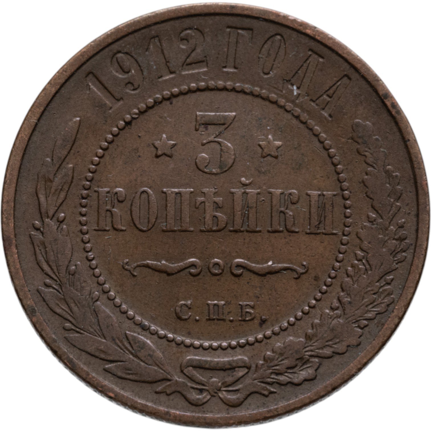 В центре указан номинал — цифра «3», ограниченная с обеих сторон звездочками. Под цифрой номинала — слово "КОПЕЙКИ". Ниже, расположен декоративный разделитель в виде двух изогнутых линий и небольшой окружности между ними. Под разделителем — обозначение монетного двора «С.П.Б.». Центральная часть отделена от остального изображения, окружностью в виде точек. В верхней части полукругом углубленная надпись: "1913 ГОДА". Ниже этой надписи, вдоль канта, изображен венок из лавровой и дубовой ветвей, которые, в нижней части, перевязаны лентой на узел бантом.
