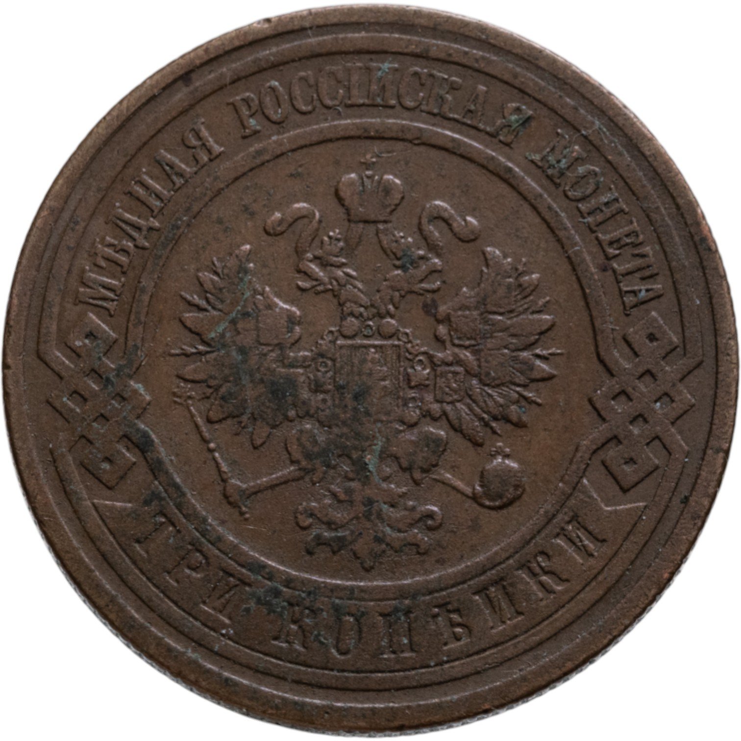 В центре монеты изображен Малый Государственный Герб Российской империи - двуглавый орел, головы которого увенчаны двумя коронами, третья, большая корона над ними. Все они соединены лентой Андрея Первозванного. В правой лапе орла – скипетр, в левой – держава. На его груди расположен Московский герб, в щите изображен Георгий Победоносец с копьем поражающий дракона. Вокруг щита цепь ордена Св. Апостола Андрея Первозванного. На крыльях орла изображены гербы: Царства Казанского, Польского, Херсонеса Таврического, Астраханского, Сибирского, Грузинского и герб соединенных княжеств Киевского, Новгородского и Владимирского — по 4 на каждое крыло. По окружности - две полукруглые плашки, соединенные узорами. На верхней плашке выпуклая надпись: "МЕДНАЯ РОССИЙСКАЯ МОНЕТА". На нижней плашке, изображенной в виде ленты, углубленная надпись: "ТРИ КОПЕЙКИ".