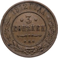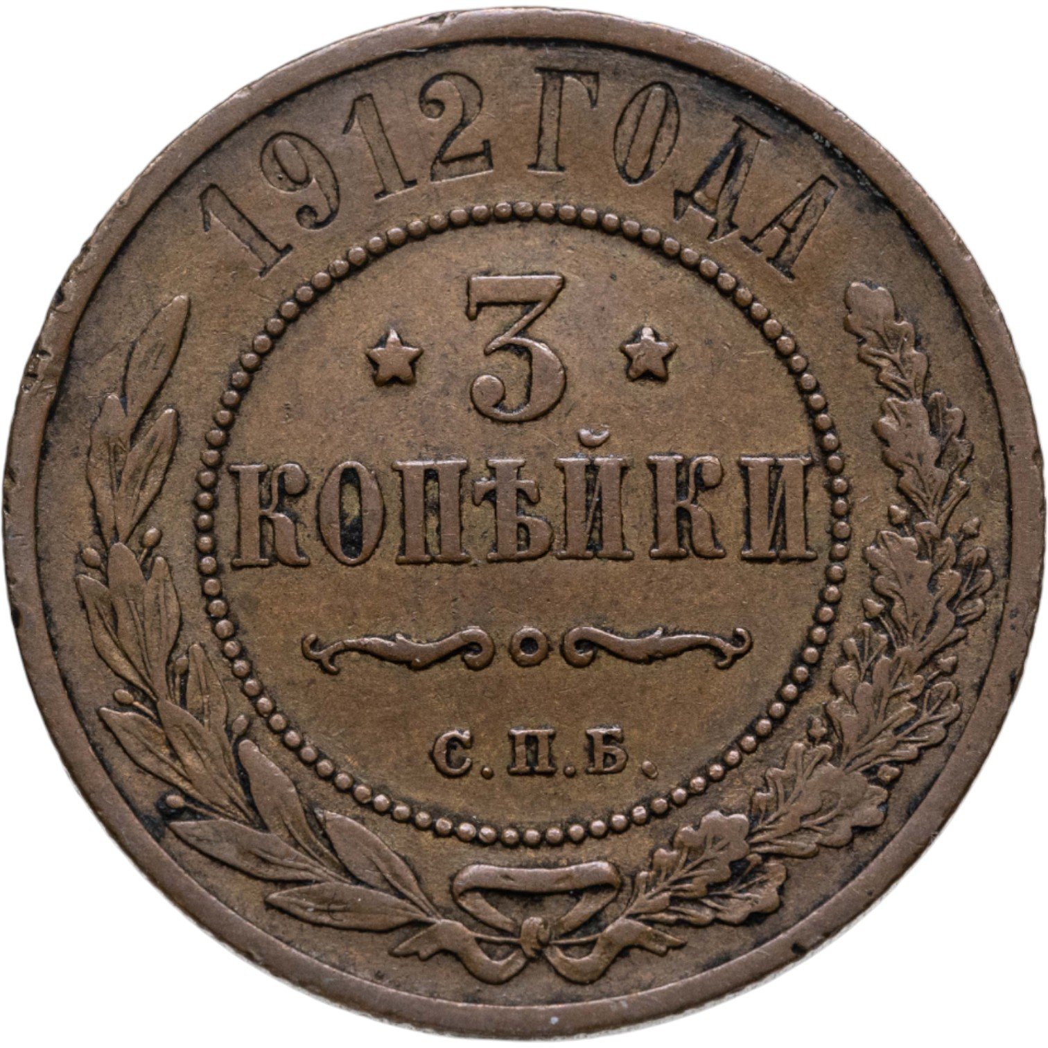 В центре указан номинал — цифра «3», ограниченная с обеих сторон звездочками. Под цифрой номинала — слово "КОПЕЙКИ". Ниже, расположен декоративный разделитель в виде двух изогнутых линий и небольшой окружности между ними. Под разделителем — обозначение монетного двора «С.П.Б.». Центральная часть отделена от остального изображения, окружностью в виде точек. В верхней части полукругом углубленная надпись: "1912 ГОДА". Ниже этой надписи, вдоль канта, изображен венок из лавровой и дубовой ветвей, которые, в нижней части, перевязаны лентой на узел бантом.