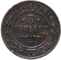 В центре монеты изображен Малый Государственный Герб Российской империи - двуглавый орел, головы которого увенчаны двумя коронами, третья, большая корона над ними. Все они соединены лентой Андрея Первозванного. В правой лапе орла – скипетр, в левой – держава. На его груди расположен Московский герб, в щите изображен Георгий Победоносец с копьем поражающий дракона. Вокруг щита цепь ордена Св. Апостола Андрея Первозванного. На крыльях орла изображены гербы: Царства Казанского, Польского, Херсонеса Таврического, Астраханского, Сибирского, Грузинского и герб соединенных княжеств Киевского, Новгородского и Владимирского — по 4 на каждое крыло. По окружности - две полукруглые плашки, соединенные узорами. На верхней плашке выпуклая надпись: "МЕДНАЯ РОССИЙСКАЯ МОНЕТА". На нижней плашке, изображенной в виде ленты, углубленная надпись: "ТРИ КОПЕЙКИ".