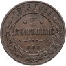 В центре монеты изображен Малый Государственный Герб Российской империи - двуглавый орел, головы которого увенчаны двумя коронами, третья, большая корона над ними. Все они соединены лентой Андрея Первозванного. В правой лапе орла – скипетр, в левой – держава. На его груди расположен Московский герб, в щите изображен Георгий Победоносец с копьем поражающий дракона. Вокруг щита цепь ордена Св. Апостола Андрея Первозванного. На крыльях орла изображены гербы: Царства Казанского, Польского, Херсонеса Таврического, Астраханского, Сибирского, Грузинского и герб соединенных княжеств Киевского, Новгородского и Владимирского — по 4 на каждое крыло. По окружности - две полукруглые плашки, соединенные узорами. На верхней плашке выпуклая надпись: "МЕДНАЯ РОССИЙСКАЯ МОНЕТА". На нижней плашке, изображенной в виде ленты, углубленная надпись: "ТРИ КОПЕЙКИ".