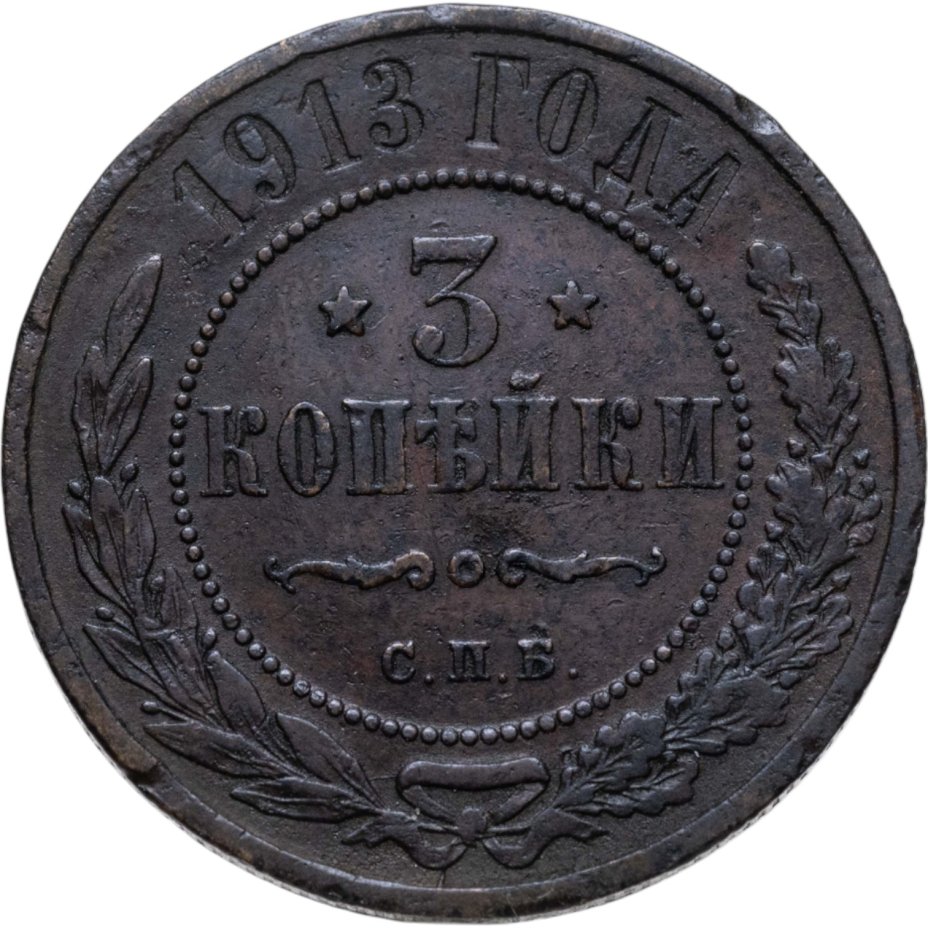 В центре указан номинал — цифра «3», ограниченная с обеих сторон звездочками. Под цифрой номинала — слово "КОПЕЙКИ". Ниже, расположен декоративный разделитель в виде двух изогнутых линий и небольшой окружности между ними. Под разделителем — обозначение монетного двора «С.П.Б.». Центральная часть отделена от остального изображения, окружностью в виде точек. В верхней части полукругом углубленная надпись: "1913 ГОДА". Ниже этой надписи, вдоль канта, изображен венок из лавровой и дубовой ветвей, которые, в нижней части, перевязаны лентой на узел бантом.