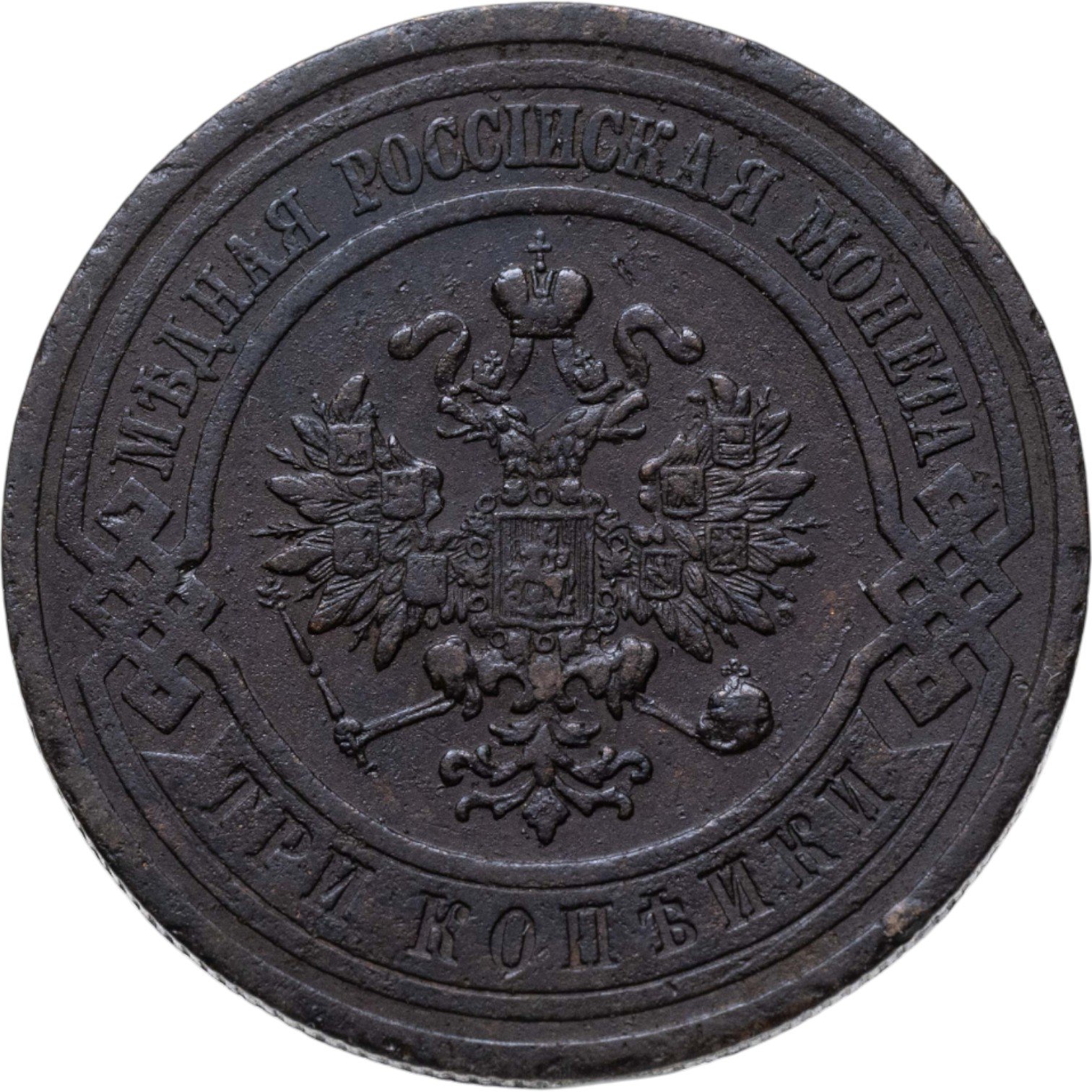 В центре монеты изображен Малый Государственный Герб Российской империи - двуглавый орел, головы которого увенчаны двумя коронами, третья, большая корона над ними. Все они соединены лентой Андрея Первозванного. В правой лапе орла – скипетр, в левой – держава. На его груди расположен Московский герб, в щите изображен Георгий Победоносец с копьем поражающий дракона. Вокруг щита цепь ордена Св. Апостола Андрея Первозванного. На крыльях орла изображены гербы: Царства Казанского, Польского, Херсонеса Таврического, Астраханского, Сибирского, Грузинского и герб соединенных княжеств Киевского, Новгородского и Владимирского — по 4 на каждое крыло. По окружности - две полукруглые плашки, соединенные узорами. На верхней плашке выпуклая надпись: "МЕДНАЯ РОССИЙСКАЯ МОНЕТА". На нижней плашке, изображенной в виде ленты, углубленная надпись: "ТРИ КОПЕЙКИ".