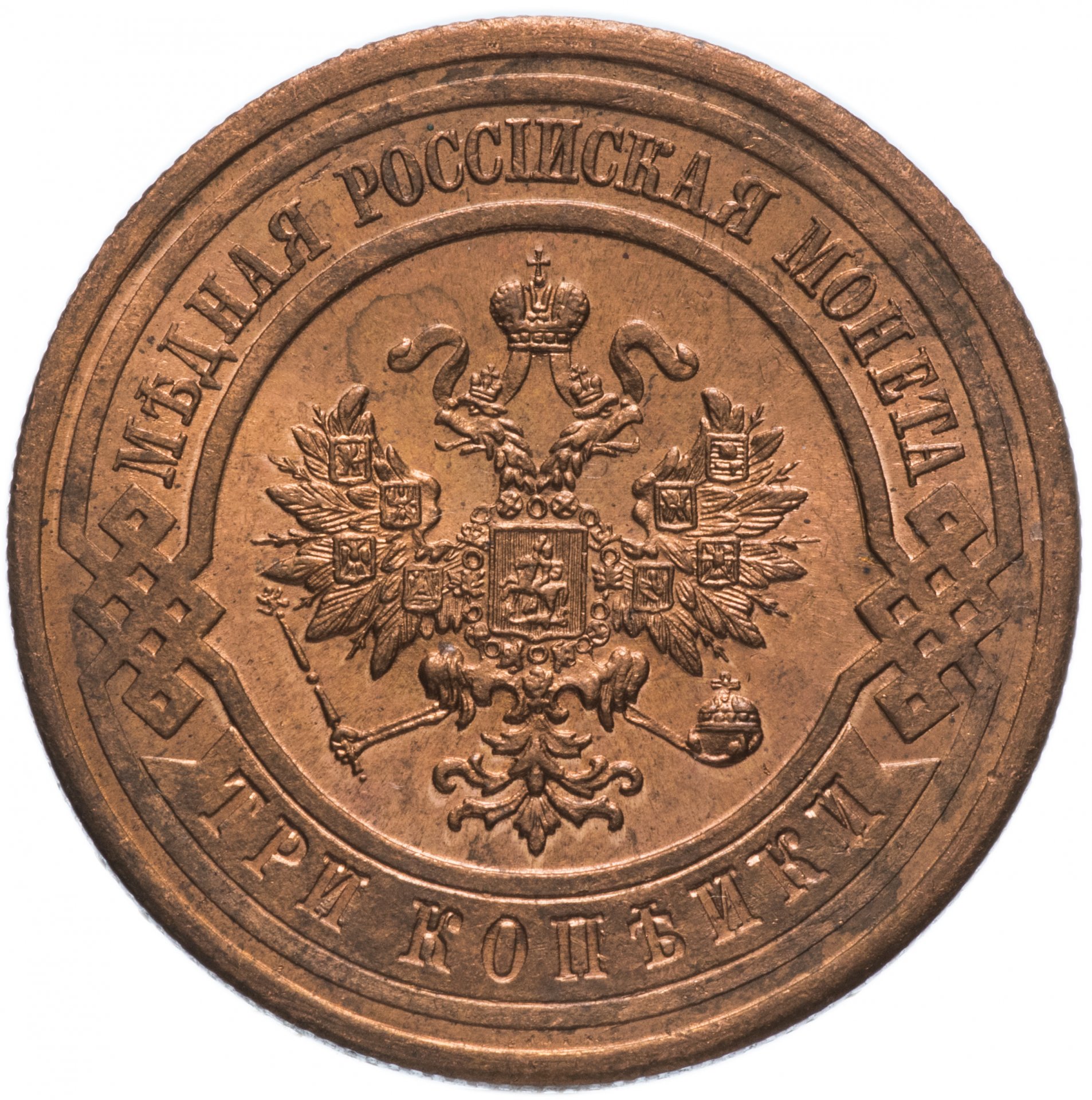 В центре монеты изображен Малый Государственный Герб Российской империи - двуглавый орел, головы которого увенчаны двумя коронами, третья, большая корона над ними. Все они соединены лентой Андрея Первозванного. В правой лапе орла – скипетр, в левой – держава. На его груди расположен Московский герб, в щите изображен Георгий Победоносец с копьем поражающий дракона. Вокруг щита цепь ордена Св. Апостола Андрея Первозванного. На крыльях орла изображены гербы: Царства Казанского, Польского, Херсонеса Таврического, Астраханского, Сибирского, Грузинского и герб соединенных княжеств Киевского, Новгородского и Владимирского — по 4 на каждое крыло. По окружности - две полукруглые плашки, соединенные узорами. На верхней плашке выпуклая надпись: "МЕДНАЯ РОССИЙСКАЯ МОНЕТА". На нижней плашке, изображенной в виде ленты, углубленная надпись: "ТРИ КОПЕЙКИ".