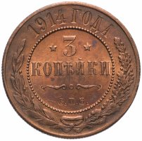 В центре указан номинал — цифра «3», ограниченная с обеих сторон звездочками. Под цифрой номинала — слово "КОПЕЙКИ". Ниже, расположен декоративный разделитель в виде двух изогнутых линий и небольшой окружности между ними. Под разделителем — обозначение монетного двора «С.П.Б.». Центральная часть отделена от остального изображения, окружностью в виде точек. В верхней части полукругом углубленная надпись: "1914 ГОДА". Ниже этой надписи, вдоль канта, изображен венок из лавровой и дубовой ветвей, которые, в нижней части, перевязаны лентой на узел бантом.