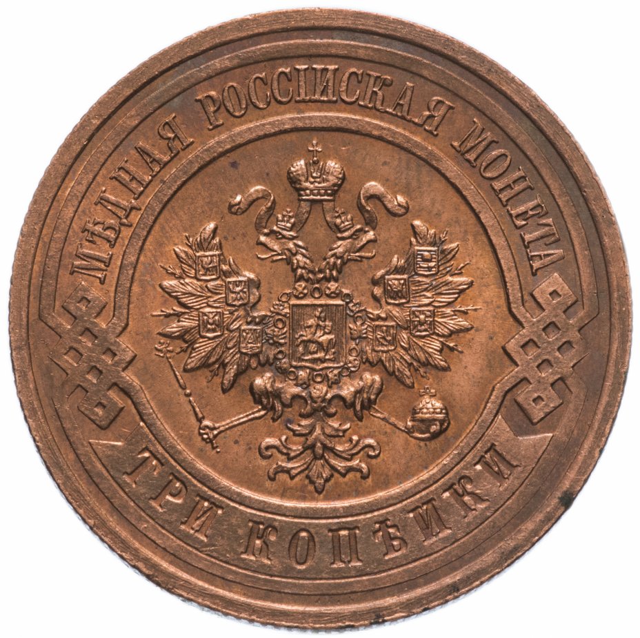 В центре монеты изображен Малый Государственный Герб Российской империи - двуглавый орел, головы которого увенчаны двумя коронами, третья, большая корона над ними. Все они соединены лентой Андрея Первозванного. В правой лапе орла – скипетр, в левой – держава. На его груди расположен Московский герб, в щите изображен Георгий Победоносец с копьем поражающий дракона. Вокруг щита цепь ордена Св. Апостола Андрея Первозванного. На крыльях орла изображены гербы: Царства Казанского, Польского, Херсонеса Таврического, Астраханского, Сибирского, Грузинского и герб соединенных княжеств Киевского, Новгородского и Владимирского — по 4 на каждое крыло. По окружности - две полукруглые плашки, соединенные узорами. На верхней плашке выпуклая надпись: "МЕДНАЯ РОССИЙСКАЯ МОНЕТА". На нижней плашке, изображенной в виде ленты, углубленная надпись: "ТРИ КОПЕЙКИ".