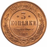 В центре указан номинал — цифра «3», ограниченная с обеих сторон звездочками. Под цифрой номинала — слово "КОПЕЙКИ". Ниже, расположен декоративный разделитель в виде двух изогнутых линий и небольшой окружности между ними. Под разделителем — обозначение монетного двора «С.П.Б.». Центральная часть отделена от остального изображения, окружностью в виде точек. В верхней части полукругом углубленная надпись: "1914 ГОДА". Ниже этой надписи, вдоль канта, изображен венок из лавровой и дубовой ветвей, которые, в нижней части, перевязаны лентой на узел бантом.