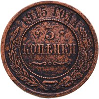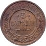 В центре монеты изображен Малый Государственный Герб Российской империи - двуглавый орел, головы которого увенчаны двумя коронами, третья, большая корона над ними. Все они соединены лентой Андрея Первозванного. В правой лапе орла – скипетр, в левой – держава. На его груди расположен Московский герб, в щите изображен Георгий Победоносец с копьем поражающий дракона. Вокруг щита цепь ордена Св. Апостола Андрея Первозванного. На крыльях орла изображены гербы: Царства Казанского, Польского, Херсонеса Таврического, Астраханского, Сибирского, Грузинского и герб соединенных княжеств Киевского, Новгородского и Владимирского — по 4 на каждое крыло. По окружности - две полукруглые плашки, соединенные узорами. На верхней плашке выпуклая надпись: "МЕДНАЯ РОССИЙСКАЯ МОНЕТА". На нижней плашке, изображенной в виде ленты, углубленная надпись: "ТРИ КОПЕЙКИ".