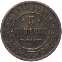 В центре указан номинал — цифра «3», ограниченная с обеих сторон звездочками. Под цифрой номинала — слово "КОПЕЙКИ". Ниже, расположен декоративный разделитель в виде двух изогнутых линий и небольшой окружности между ними. Центральная часть отделена от остального изображения, окружностью в виде точек. В верхней части полукругом углубленная надпись: "1915 ГОДА". Ниже этой надписи, вдоль канта, изображен венок из лавровой и дубовой ветвей, которые, в нижней части, перевязаны лентой на узел бантом.