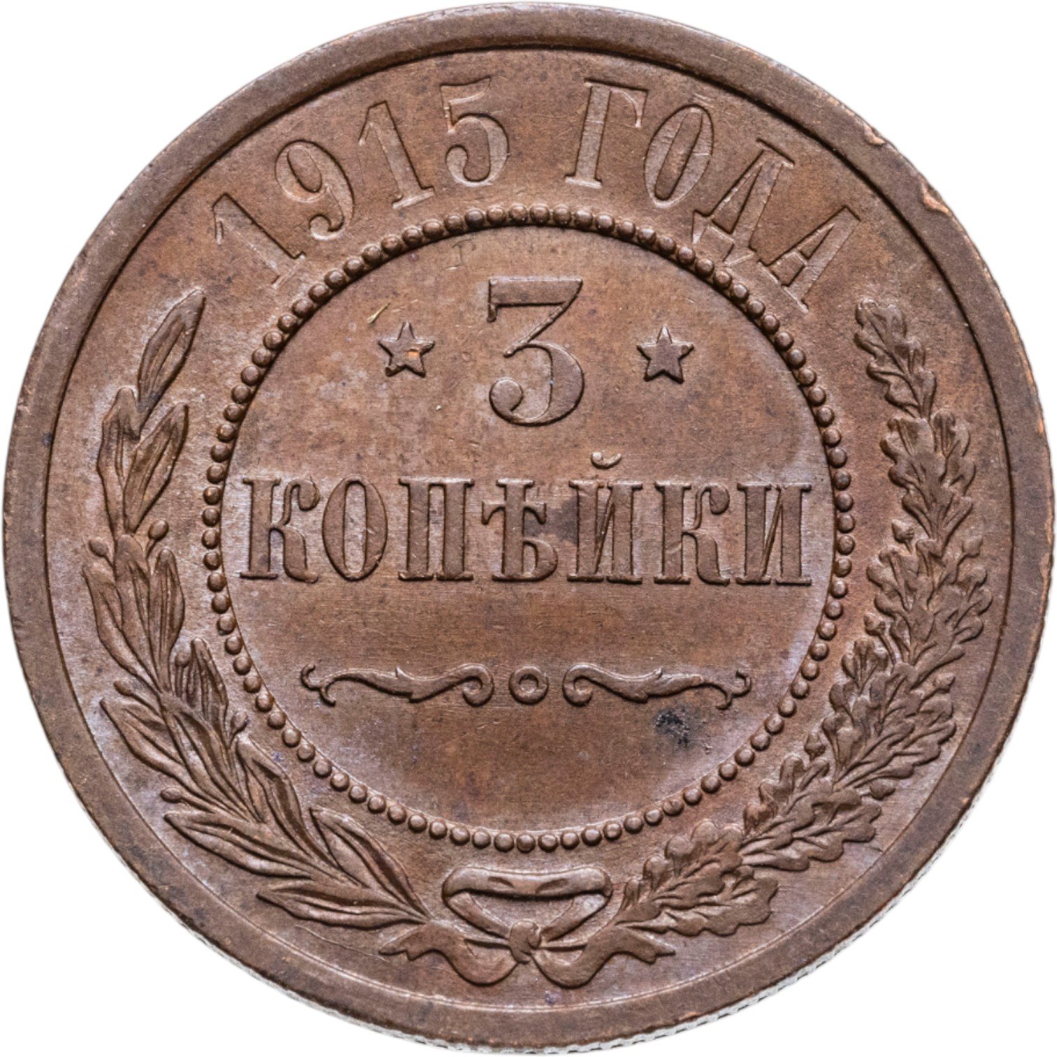 В центре указан номинал — цифра «3», ограниченная с обеих сторон звездочками. Под цифрой номинала — слово "КОПЕЙКИ". Ниже, расположен декоративный разделитель в виде двух изогнутых линий и небольшой окружности между ними. Центральная часть отделена от остального изображения, окружностью в виде точек. В верхней части полукругом углубленная надпись: "1915 ГОДА". Ниже этой надписи, вдоль канта, изображен венок из лавровой и дубовой ветвей, которые, в нижней части, перевязаны лентой на узел бантом.