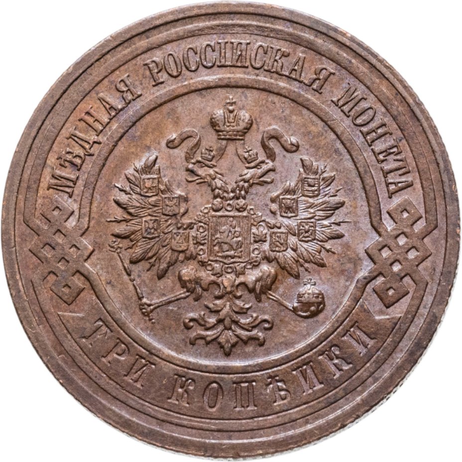 В центре монеты изображен Малый Государственный Герб Российской империи - двуглавый орел, головы которого увенчаны двумя коронами, третья, большая корона над ними. Все они соединены лентой Андрея Первозванного. В правой лапе орла – скипетр, в левой – держава. На его груди расположен Московский герб, в щите изображен Георгий Победоносец с копьем поражающий дракона. Вокруг щита цепь ордена Св. Апостола Андрея Первозванного. На крыльях орла изображены гербы: Царства Казанского, Польского, Херсонеса Таврического, Астраханского, Сибирского, Грузинского и герб соединенных княжеств Киевского, Новгородского и Владимирского — по 4 на каждое крыло. По окружности - две полукруглые плашки, соединенные узорами. На верхней плашке выпуклая надпись: "МЕДНАЯ РОССИЙСКАЯ МОНЕТА". На нижней плашке, изображенной в виде ленты, углубленная надпись: "ТРИ КОПЕЙКИ".
