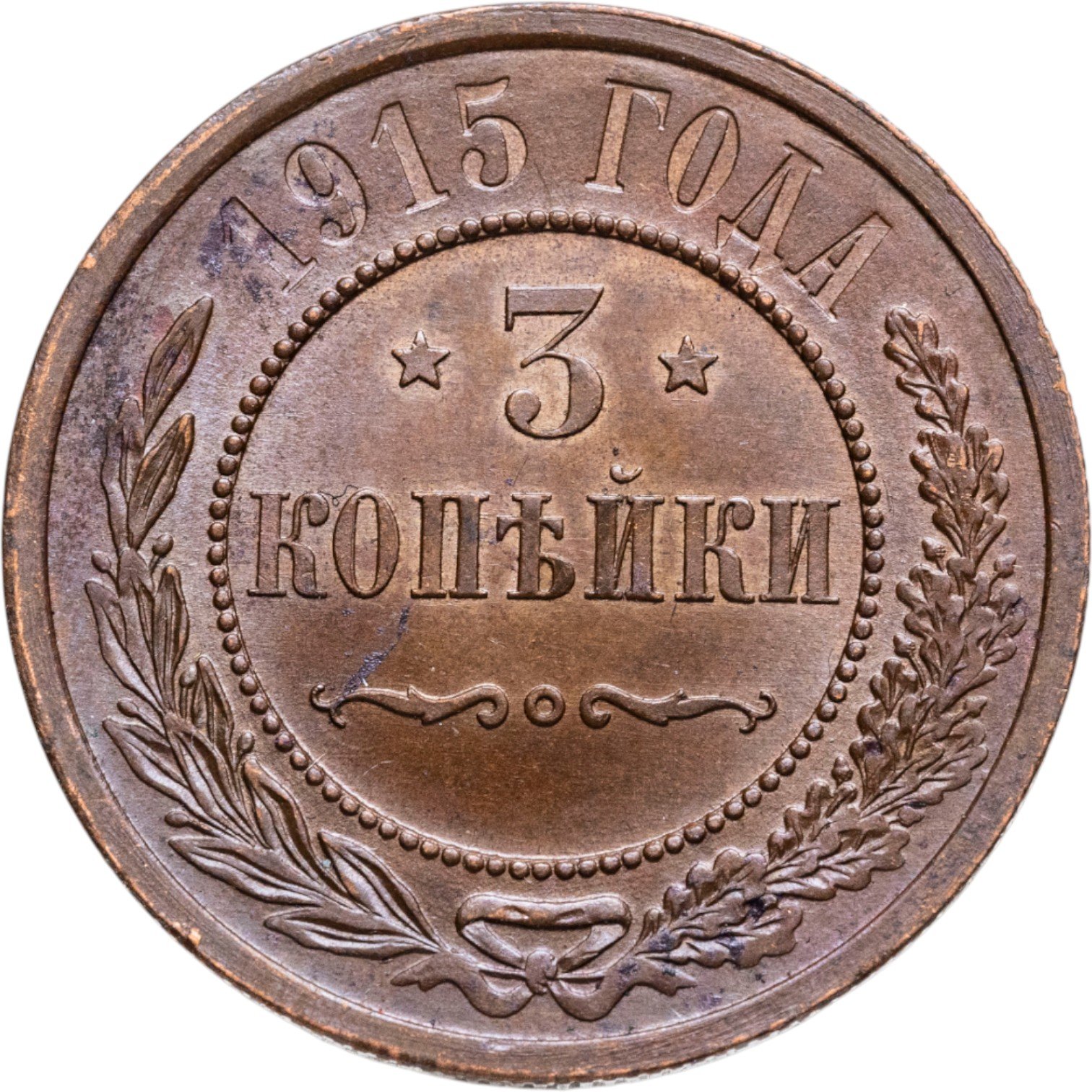 В центре указан номинал — цифра «3», ограниченная с обеих сторон звездочками. Под цифрой номинала — слово "КОПЕЙКИ". Ниже, расположен декоративный разделитель в виде двух изогнутых линий и небольшой окружности между ними. Центральная часть отделена от остального изображения, окружностью в виде точек. В верхней части полукругом углубленная надпись: "1915 ГОДА". Ниже этой надписи, вдоль канта, изображен венок из лавровой и дубовой ветвей, которые, в нижней части, перевязаны лентой на узел бантом.