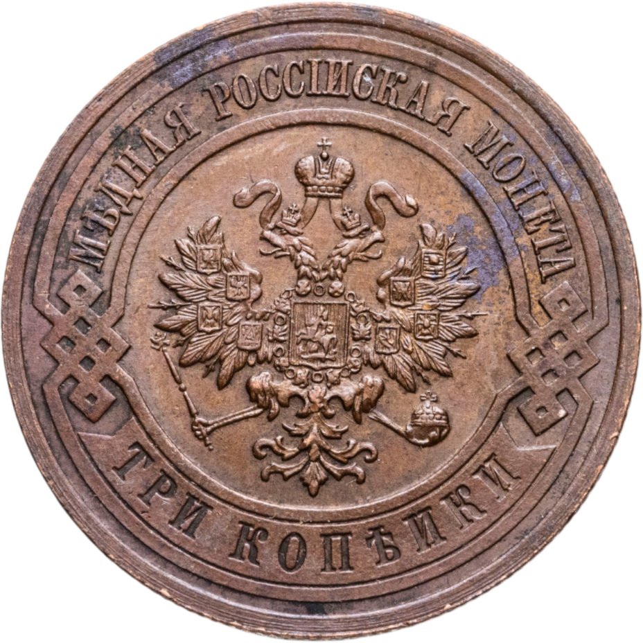 В центре монеты изображен Малый Государственный Герб Российской империи - двуглавый орел, головы которого увенчаны двумя коронами, третья, большая корона над ними. Все они соединены лентой Андрея Первозванного. В правой лапе орла – скипетр, в левой – держава. На его груди расположен Московский герб, в щите изображен Георгий Победоносец с копьем поражающий дракона. Вокруг щита цепь ордена Св. Апостола Андрея Первозванного. На крыльях орла изображены гербы: Царства Казанского, Польского, Херсонеса Таврического, Астраханского, Сибирского, Грузинского и герб соединенных княжеств Киевского, Новгородского и Владимирского — по 4 на каждое крыло. По окружности - две полукруглые плашки, соединенные узорами. На верхней плашке выпуклая надпись: "МЕДНАЯ РОССИЙСКАЯ МОНЕТА". На нижней плашке, изображенной в виде ленты, углубленная надпись: "ТРИ КОПЕЙКИ".
