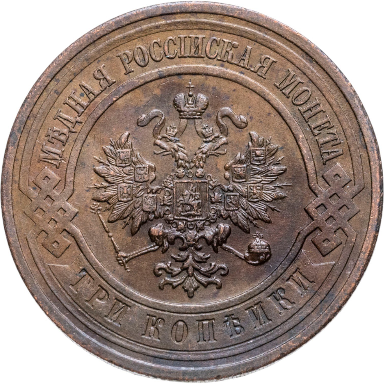 В центре монеты изображен Малый Государственный Герб Российской империи - двуглавый орел, головы которого увенчаны двумя коронами, третья, большая корона над ними. Все они соединены лентой Андрея Первозванного. В правой лапе орла – скипетр, в левой – держава. На его груди расположен Московский герб, в щите изображен Георгий Победоносец с копьем поражающий дракона. Вокруг щита цепь ордена Св. Апостола Андрея Первозванного. На крыльях орла изображены гербы: Царства Казанского, Польского, Херсонеса Таврического, Астраханского, Сибирского, Грузинского и герб соединенных княжеств Киевского, Новгородского и Владимирского — по 4 на каждое крыло. По окружности - две полукруглые плашки, соединенные узорами. На верхней плашке выпуклая надпись: "МЕДНАЯ РОССИЙСКАЯ МОНЕТА". На нижней плашке, изображенной в виде ленты, углубленная надпись: "ТРИ КОПЕЙКИ".