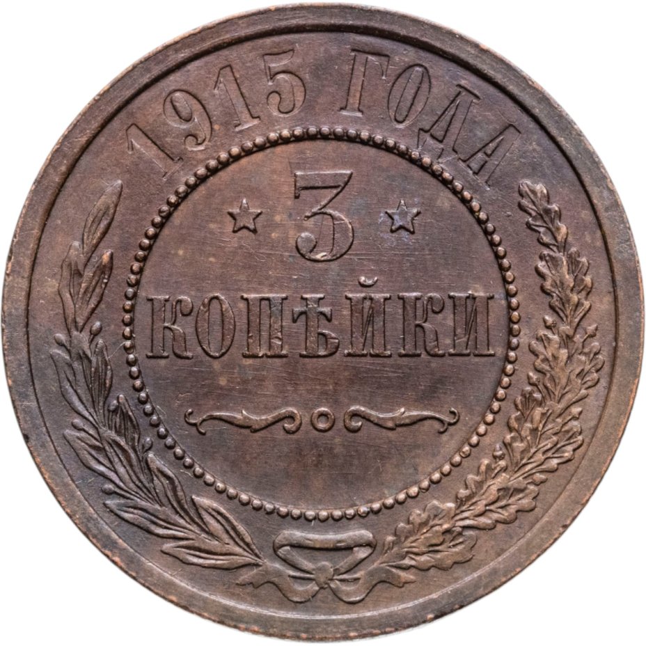 В центре указан номинал — цифра «3», ограниченная с обеих сторон звездочками. Под цифрой номинала — слово "КОПЕЙКИ". Ниже, расположен декоративный разделитель в виде двух изогнутых линий и небольшой окружности между ними. Центральная часть отделена от остального изображения, окружностью в виде точек. В верхней части полукругом углубленная надпись: "1915 ГОДА". Ниже этой надписи, вдоль канта, изображен венок из лавровой и дубовой ветвей, которые, в нижней части, перевязаны лентой на узел бантом.