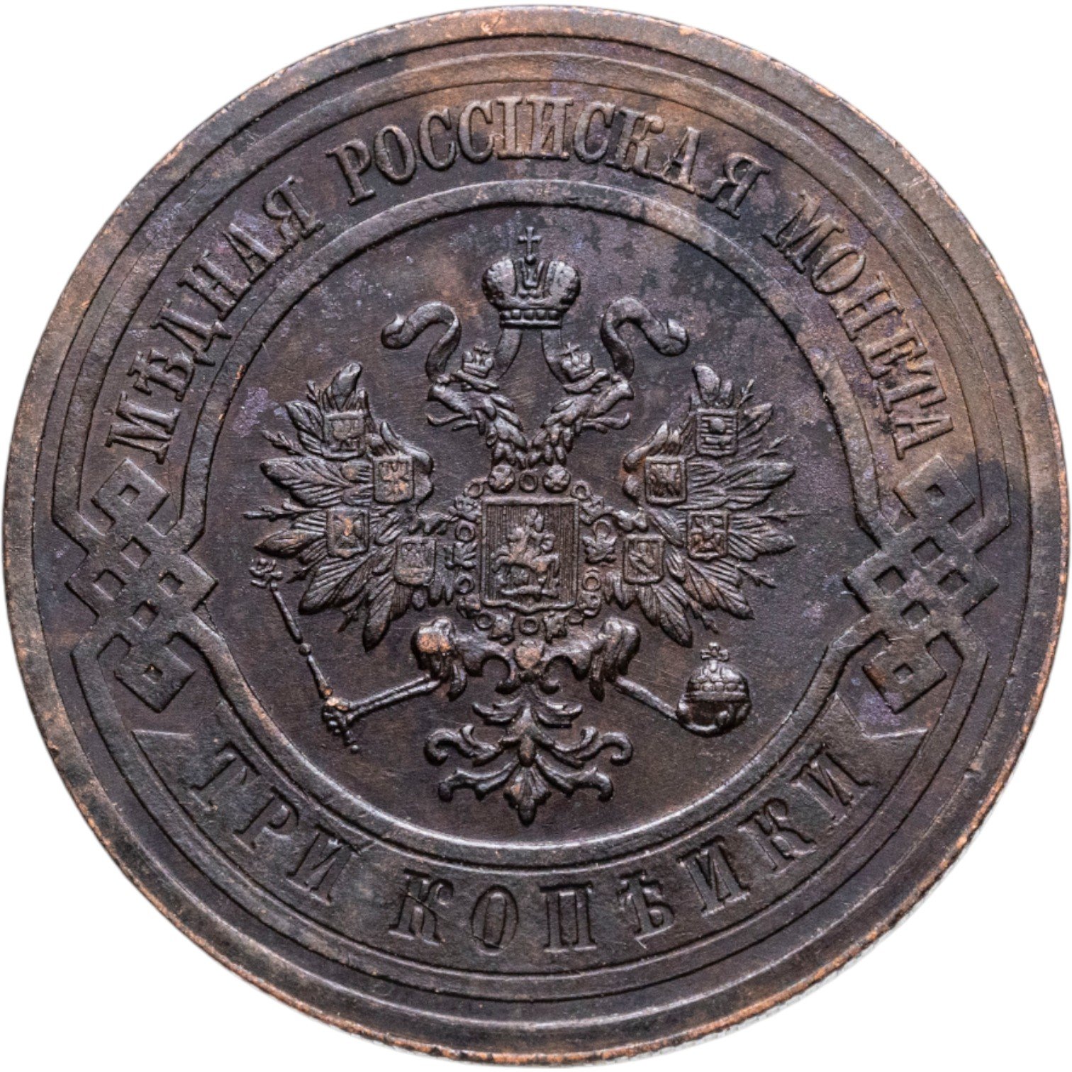 В центре монеты изображен Малый Государственный Герб Российской империи - двуглавый орел, головы которого увенчаны двумя коронами, третья, большая корона над ними. Все они соединены лентой Андрея Первозванного. В правой лапе орла – скипетр, в левой – держава. На его груди расположен Московский герб, в щите изображен Георгий Победоносец с копьем поражающий дракона. Вокруг щита цепь ордена Св. Апостола Андрея Первозванного. На крыльях орла изображены гербы: Царства Казанского, Польского, Херсонеса Таврического, Астраханского, Сибирского, Грузинского и герб соединенных княжеств Киевского, Новгородского и Владимирского — по 4 на каждое крыло. По окружности - две полукруглые плашки, соединенные узорами. На верхней плашке выпуклая надпись: "МЕДНАЯ РОССИЙСКАЯ МОНЕТА". На нижней плашке, изображенной в виде ленты, углубленная надпись: "ТРИ КОПЕЙКИ".