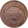 В центре монеты изображен Малый Государственный Герб Российской империи - двуглавый орел, головы которого увенчаны двумя коронами, третья, большая корона над ними. Все они соединены лентой Андрея Первозванного. В правой лапе орла – скипетр, в левой – держава. На его груди расположен Московский герб, в щите изображен Георгий Победоносец с копьем поражающий дракона. Вокруг щита цепь ордена Св. Апостола Андрея Первозванного. На крыльях орла изображены гербы: Царства Казанского, Польского, Херсонеса Таврического, Астраханского, Сибирского, Грузинского и герб соединенных княжеств Киевского, Новгородского и Владимирского — по 4 на каждое крыло. По окружности - две полукруглые плашки, соединенные узорами. На верхней плашке выпуклая надпись: "МЕДНАЯ РОССИЙСКАЯ МОНЕТА". На нижней плашке, изображенной в виде ленты, углубленная надпись: "ТРИ КОПЕЙКИ".