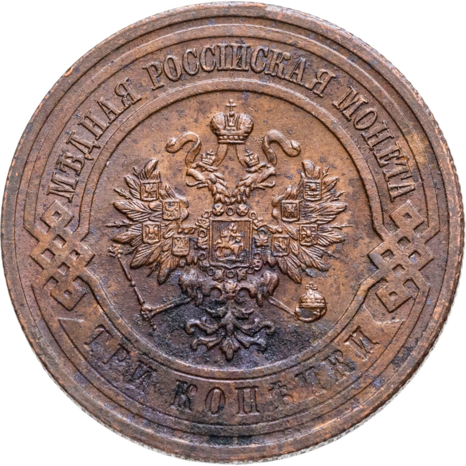 В центре монеты изображен Малый Государственный Герб Российской империи - двуглавый орел, головы которого увенчаны двумя коронами, третья, большая корона над ними. Все они соединены лентой Андрея Первозванного. В правой лапе орла – скипетр, в левой – держава. На его груди расположен Московский герб, в щите изображен Георгий Победоносец с копьем поражающий дракона. Вокруг щита цепь ордена Св. Апостола Андрея Первозванного. На крыльях орла изображены гербы: Царства Казанского, Польского, Херсонеса Таврического, Астраханского, Сибирского, Грузинского и герб соединенных княжеств Киевского, Новгородского и Владимирского — по 4 на каждое крыло. По окружности - две полукруглые плашки, соединенные узорами. На верхней плашке выпуклая надпись: "МЕДНАЯ РОССИЙСКАЯ МОНЕТА". На нижней плашке, изображенной в виде ленты, углубленная надпись: "ТРИ КОПЕЙКИ".