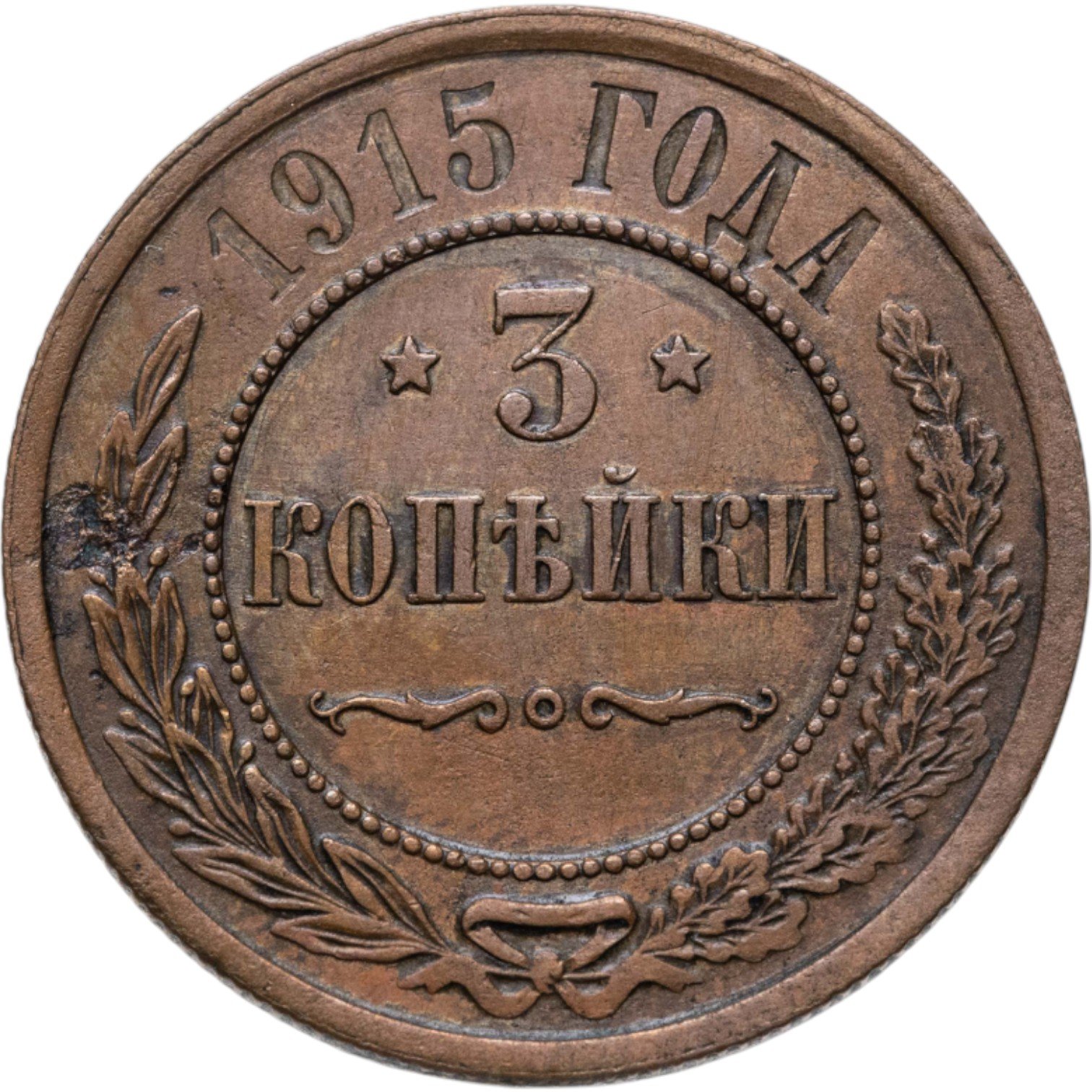 В центре указан номинал — цифра «3», ограниченная с обеих сторон звездочками. Под цифрой номинала — слово "КОПЕЙКИ". Ниже, расположен декоративный разделитель в виде двух изогнутых линий и небольшой окружности между ними. Центральная часть отделена от остального изображения, окружностью в виде точек. В верхней части полукругом углубленная надпись: "1915 ГОДА". Ниже этой надписи, вдоль канта, изображен венок из лавровой и дубовой ветвей, которые, в нижней части, перевязаны лентой на узел бантом.