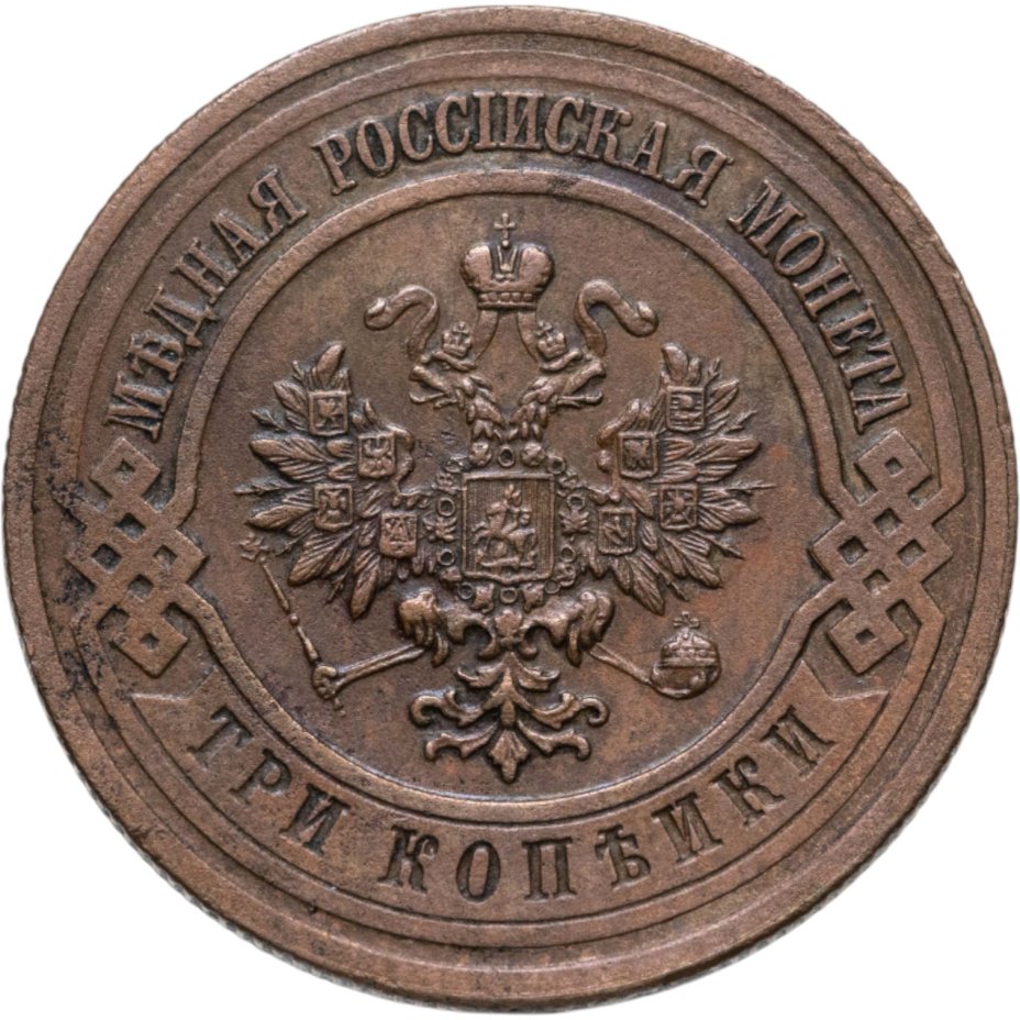 В центре монеты изображен Малый Государственный Герб Российской империи - двуглавый орел, головы которого увенчаны двумя коронами, третья, большая корона над ними. Все они соединены лентой Андрея Первозванного. В правой лапе орла – скипетр, в левой – держава. На его груди расположен Московский герб, в щите изображен Георгий Победоносец с копьем поражающий дракона. Вокруг щита цепь ордена Св. Апостола Андрея Первозванного. На крыльях орла изображены гербы: Царства Казанского, Польского, Херсонеса Таврического, Астраханского, Сибирского, Грузинского и герб соединенных княжеств Киевского, Новгородского и Владимирского — по 4 на каждое крыло. По окружности - две полукруглые плашки, соединенные узорами. На верхней плашке выпуклая надпись: "МЕДНАЯ РОССИЙСКАЯ МОНЕТА". На нижней плашке, изображенной в виде ленты, углубленная надпись: "ТРИ КОПЕЙКИ".