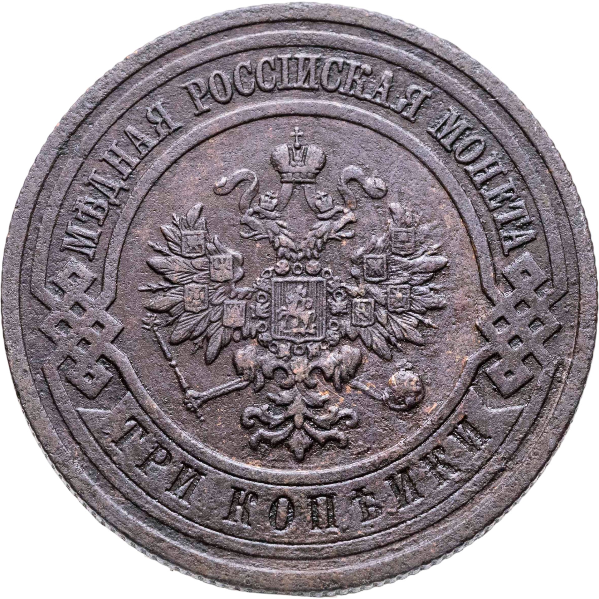 В центре монеты изображен Малый Государственный Герб Российской империи - двуглавый орел, головы которого увенчаны двумя коронами, третья, большая корона над ними. Все они соединены лентой Андрея Первозванного. В правой лапе орла – скипетр, в левой – держава. На его груди расположен Московский герб, в щите изображен Георгий Победоносец с копьем поражающий дракона. Вокруг щита цепь ордена Св. Апостола Андрея Первозванного. На крыльях орла изображены гербы: Царства Казанского, Польского, Херсонеса Таврического, Астраханского, Сибирского, Грузинского и герб соединенных княжеств Киевского, Новгородского и Владимирского — по 4 на каждое крыло. По окружности - две полукруглые плашки, соединенные узорами. На верхней плашке выпуклая надпись: "МЕДНАЯ РОССИЙСКАЯ МОНЕТА". На нижней плашке, изображенной в виде ленты, углубленная надпись: "ТРИ КОПЕЙКИ".