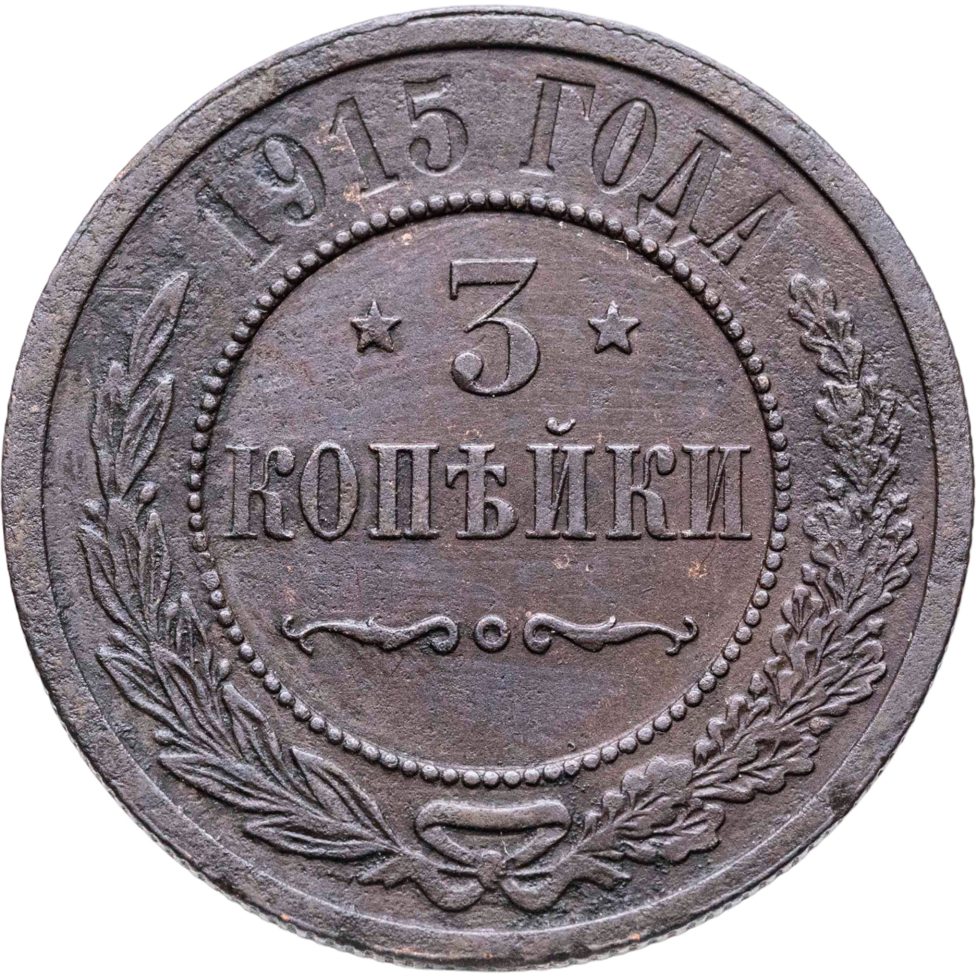 В центре указан номинал — цифра «3», ограниченная с обеих сторон звездочками. Под цифрой номинала — слово "КОПЕЙКИ". Ниже, расположен декоративный разделитель в виде двух изогнутых линий и небольшой окружности между ними. Центральная часть отделена от остального изображения, окружностью в виде точек. В верхней части полукругом углубленная надпись: "1915 ГОДА". Ниже этой надписи, вдоль канта, изображен венок из лавровой и дубовой ветвей, которые, в нижней части, перевязаны лентой на узел бантом.