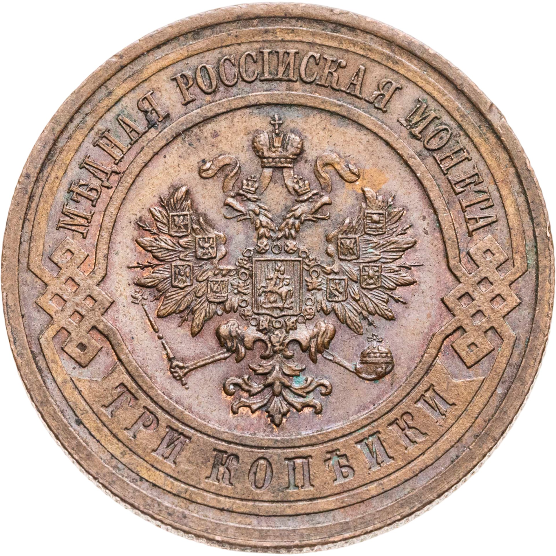 В центре монеты изображен Малый Государственный Герб Российской империи - двуглавый орел, головы которого увенчаны двумя коронами, третья, большая корона над ними. Все они соединены лентой Андрея Первозванного. В правой лапе орла – скипетр, в левой – держава. На его груди расположен Московский герб, в щите изображен Георгий Победоносец с копьем поражающий дракона. Вокруг щита цепь ордена Св. Апостола Андрея Первозванного. На крыльях орла изображены гербы: Царства Казанского, Польского, Херсонеса Таврического, Астраханского, Сибирского, Грузинского и герб соединенных княжеств Киевского, Новгородского и Владимирского — по 4 на каждое крыло. По окружности - две полукруглые плашки, соединенные узорами. На верхней плашке выпуклая надпись: "МЕДНАЯ РОССИЙСКАЯ МОНЕТА". На нижней плашке, изображенной в виде ленты, углубленная надпись: "ТРИ КОПЕЙКИ".