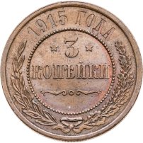 В центре указан номинал — цифра «3», ограниченная с обеих сторон звездочками. Под цифрой номинала — слово "КОПЕЙКИ". Ниже, расположен декоративный разделитель в виде двух изогнутых линий и небольшой окружности между ними. Центральная часть отделена от остального изображения, окружностью в виде точек. В верхней части полукругом углубленная надпись: "1915 ГОДА". Ниже этой надписи, вдоль канта, изображен венок из лавровой и дубовой ветвей, которые, в нижней части, перевязаны лентой на узел бантом.