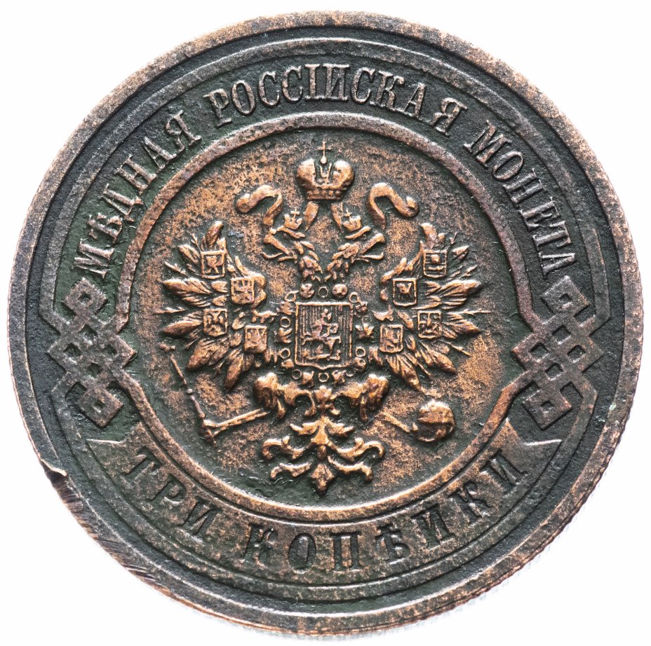 В центре монеты изображен Малый Государственный Герб Российской империи - двуглавый орел, головы которого увенчаны двумя коронами, третья, большая корона над ними. Все они соединены лентой Андрея Первозванного. В правой лапе орла – скипетр, в левой – держава. На его груди расположен Московский герб, в щите изображен Георгий Победоносец с копьем поражающий дракона. Вокруг щита цепь ордена Св. Апостола Андрея Первозванного. На крыльях орла изображены гербы: Царства Казанского, Польского, Херсонеса Таврического, Астраханского, Сибирского, Грузинского и герб соединенных княжеств Киевского, Новгородского и Владимирского — по 4 на каждое крыло. По окружности - две полукруглые плашки, соединенные узорами. На верхней плашке выпуклая надпись: "МЕДНАЯ РОССИЙСКАЯ МОНЕТА". На нижней плашке, изображенной в виде ленты, углубленная надпись: "ТРИ КОПЕЙКИ".